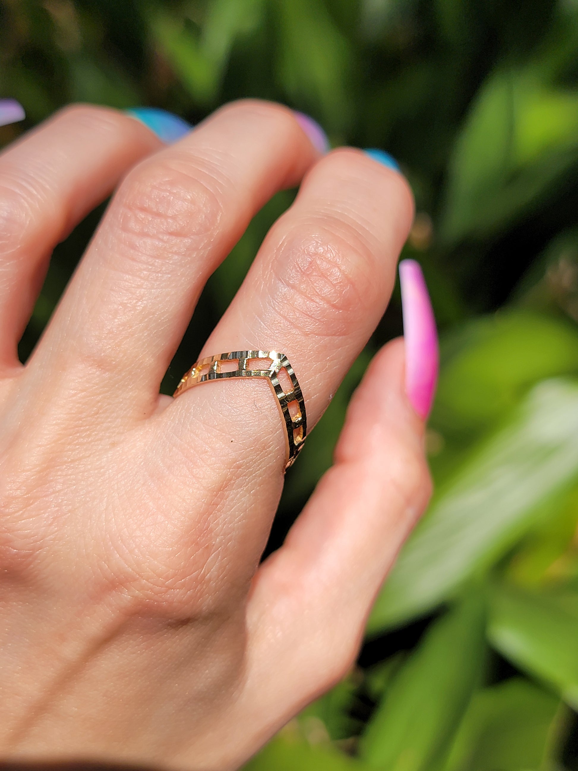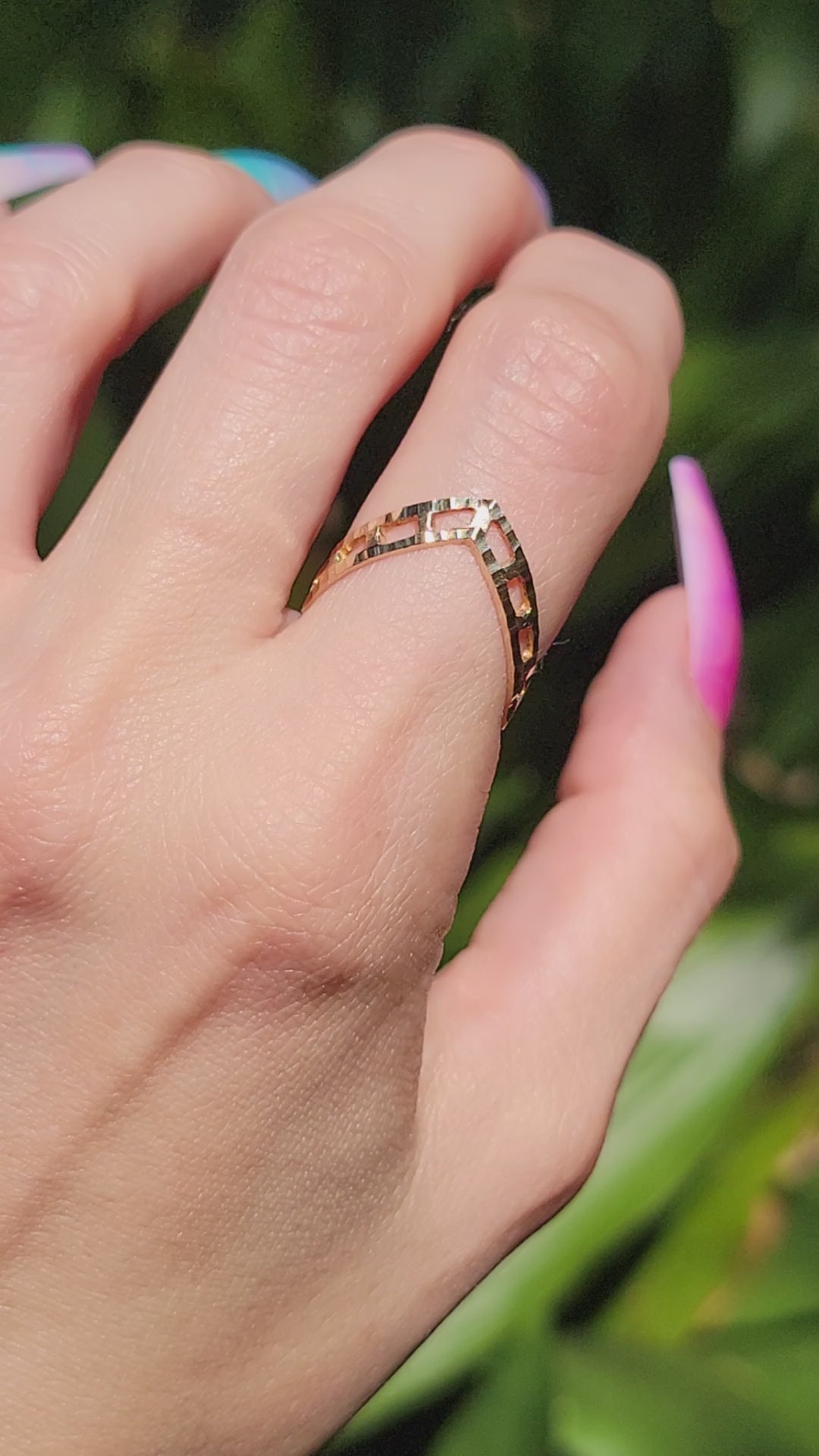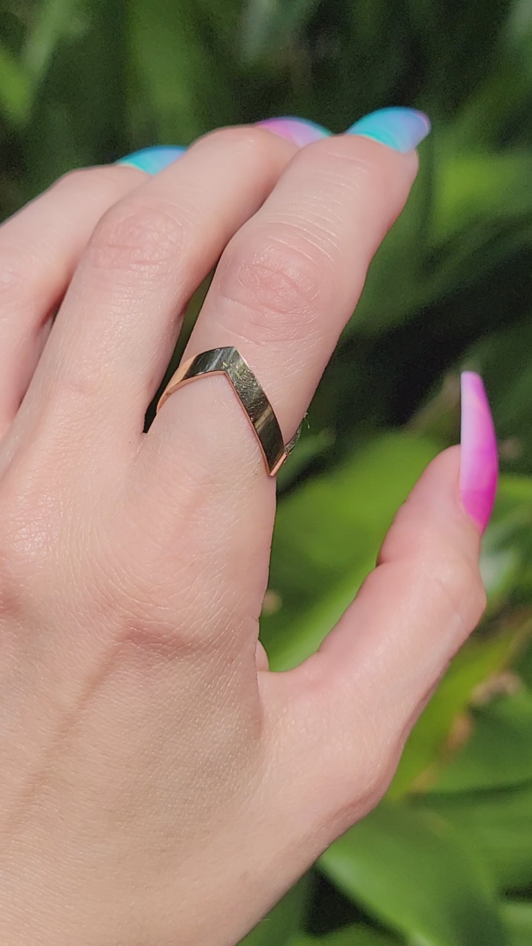 She's got a wild side. Rarely are the terms versatile and dramatic used to describe a singular piece. However, this amazing ring will bring the drama in a stack for the ages, but turns heads all by itself. Whether you're feeling a classic solid chevron, or the flash of the diamond cutting, she's got you covered. No matter the jewelry mood you wake up in, this chevron has the personality to match. Don't miss out!
