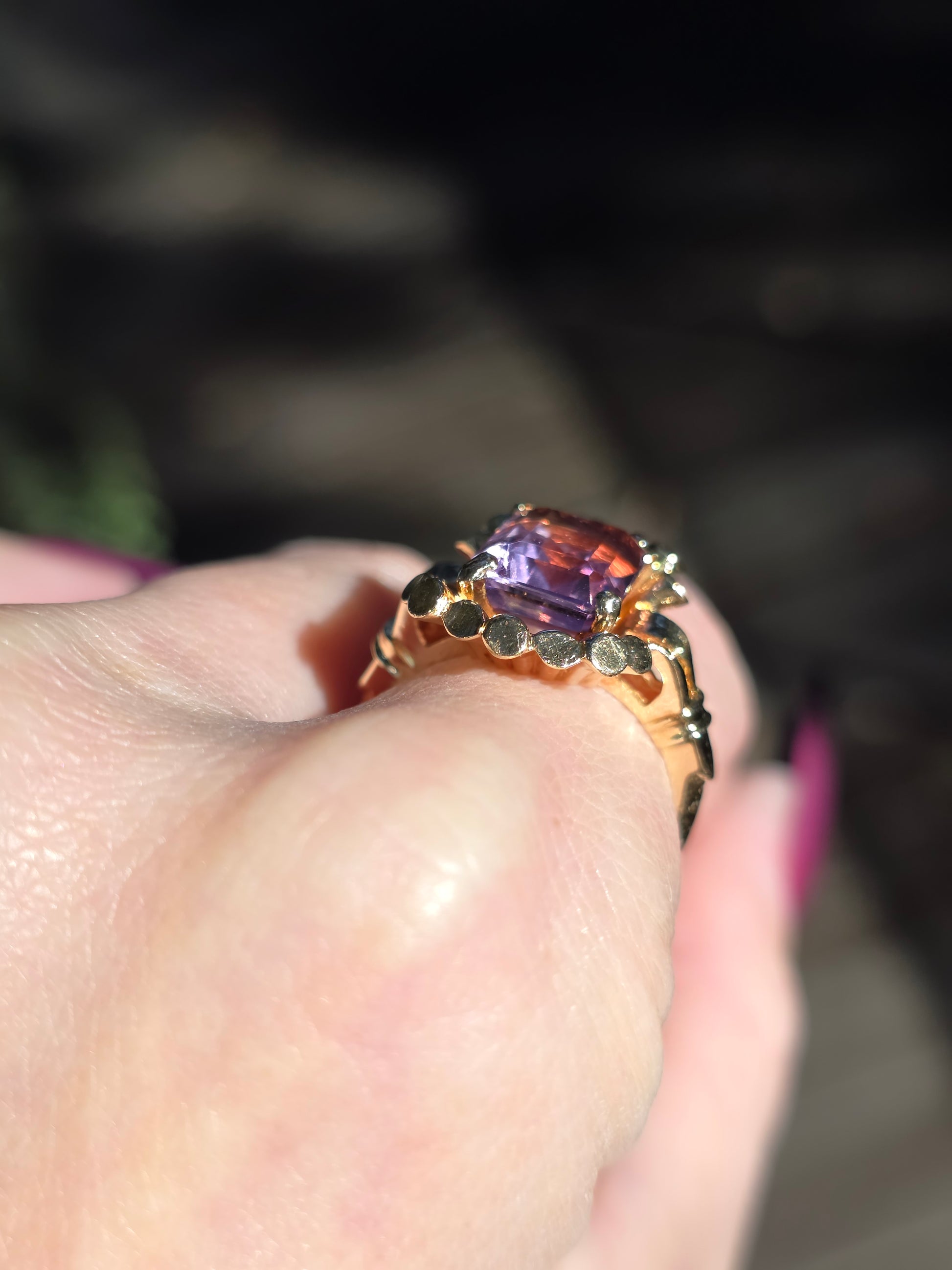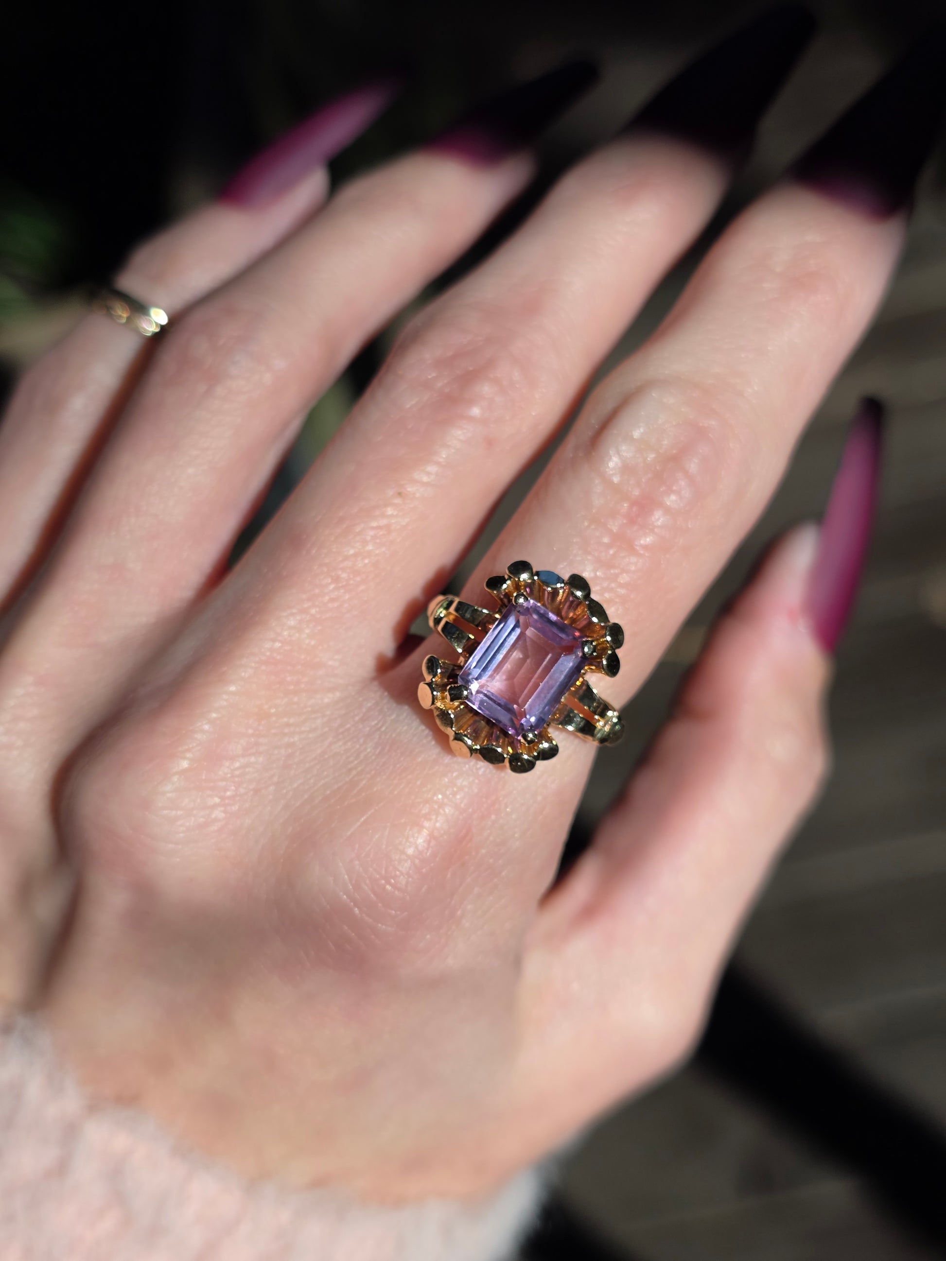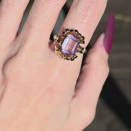 Slip on this 14k amethyst ring and let its radiant purple hues transport you to a world of pure magic. More than just jewelry, it's a wearable reminder that life's most dazzling moments deserve to sparkle. This beauty strikes the perfect balance between show-stopping elegance and everyday wearability. Whether you're drawn to amethyst's legendary charm or simply can't resist its mesmerizing glow, this is the kind of find that makes you feel like you've struck gold. A vintage treasure that's ready to become part of your story. Don't miss your opportunity!