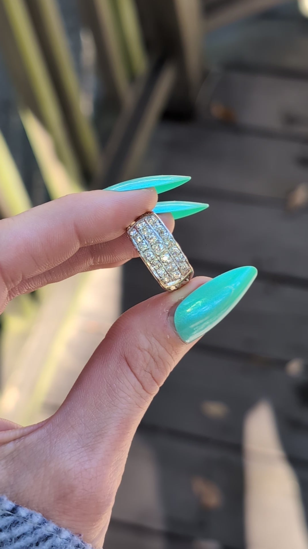 The sparkles beaming off of this amazing little Art Deco band ring are intense. 21 little rainbow makers will make your presence undeniable. We fell in love with the craftsmanship and quality of this piece. She comfortable and sits low on the finger. You may not always feel it on, but your eyes will not let you forget. No one around you will either! Be prepared to show it off. We know you'll love her. They don't make them like this anymore. Don't miss this opportunity.
