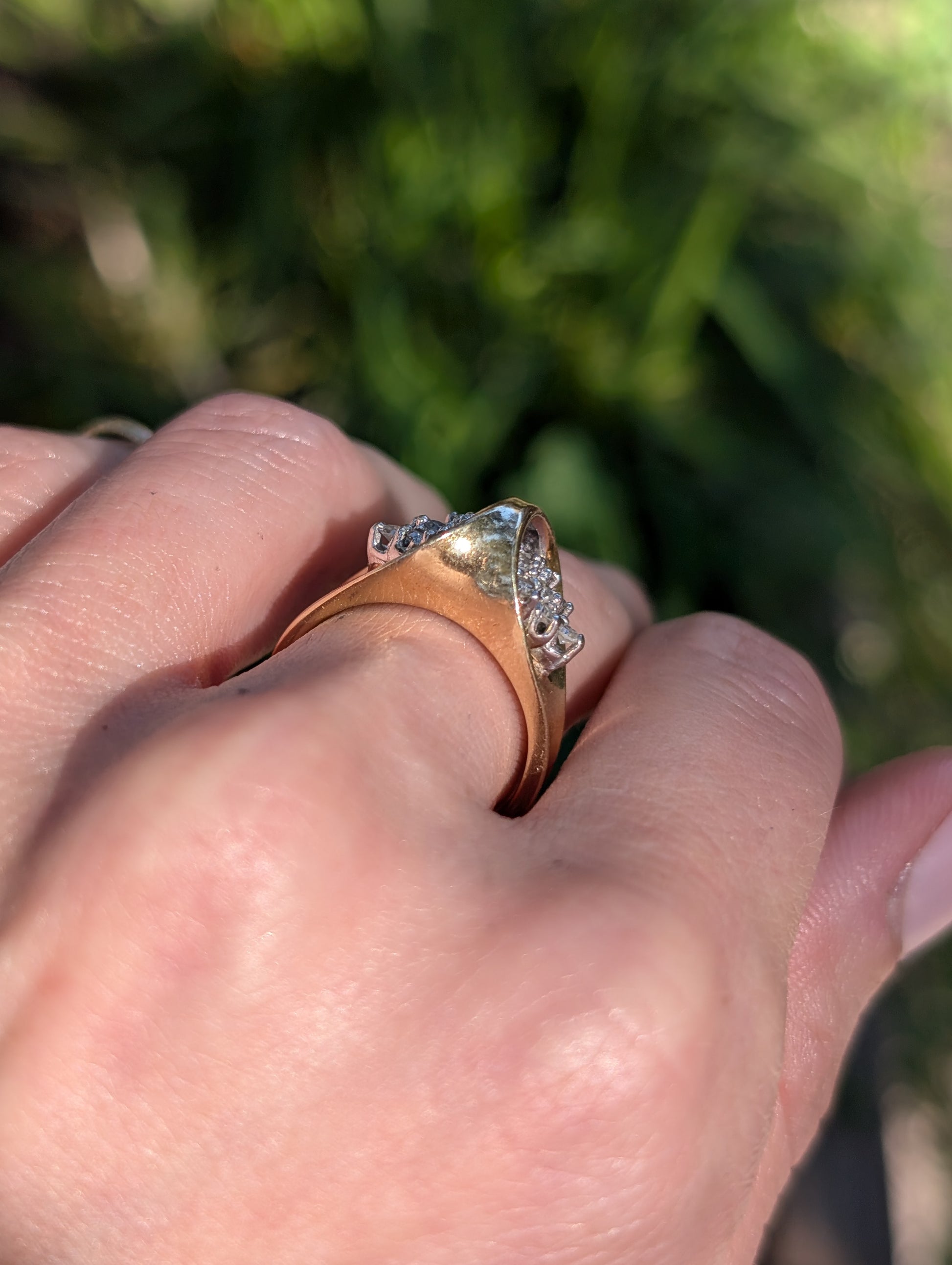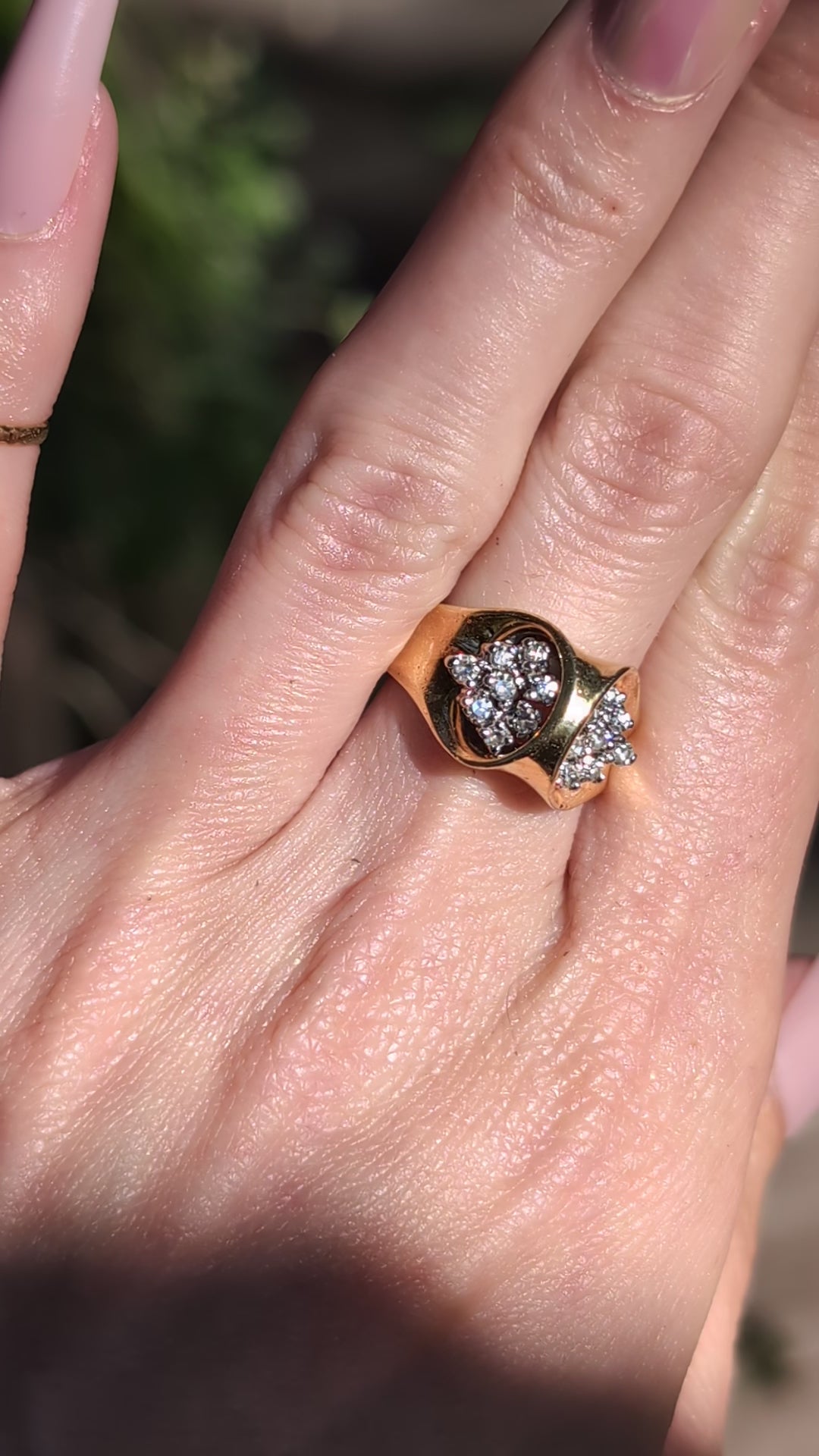 This beautiful vintage piece is an amazing representation of a jewelry lover's dream. Imagine a beautiful flowing river of diamonds. Forget about white water, this is river is filled with sparkle rapids. How does one cross a stunning river of diamonds? A 14k bridge of gold of course! Be careful looking down from this bridge too long, it's easy to get mesmerized.