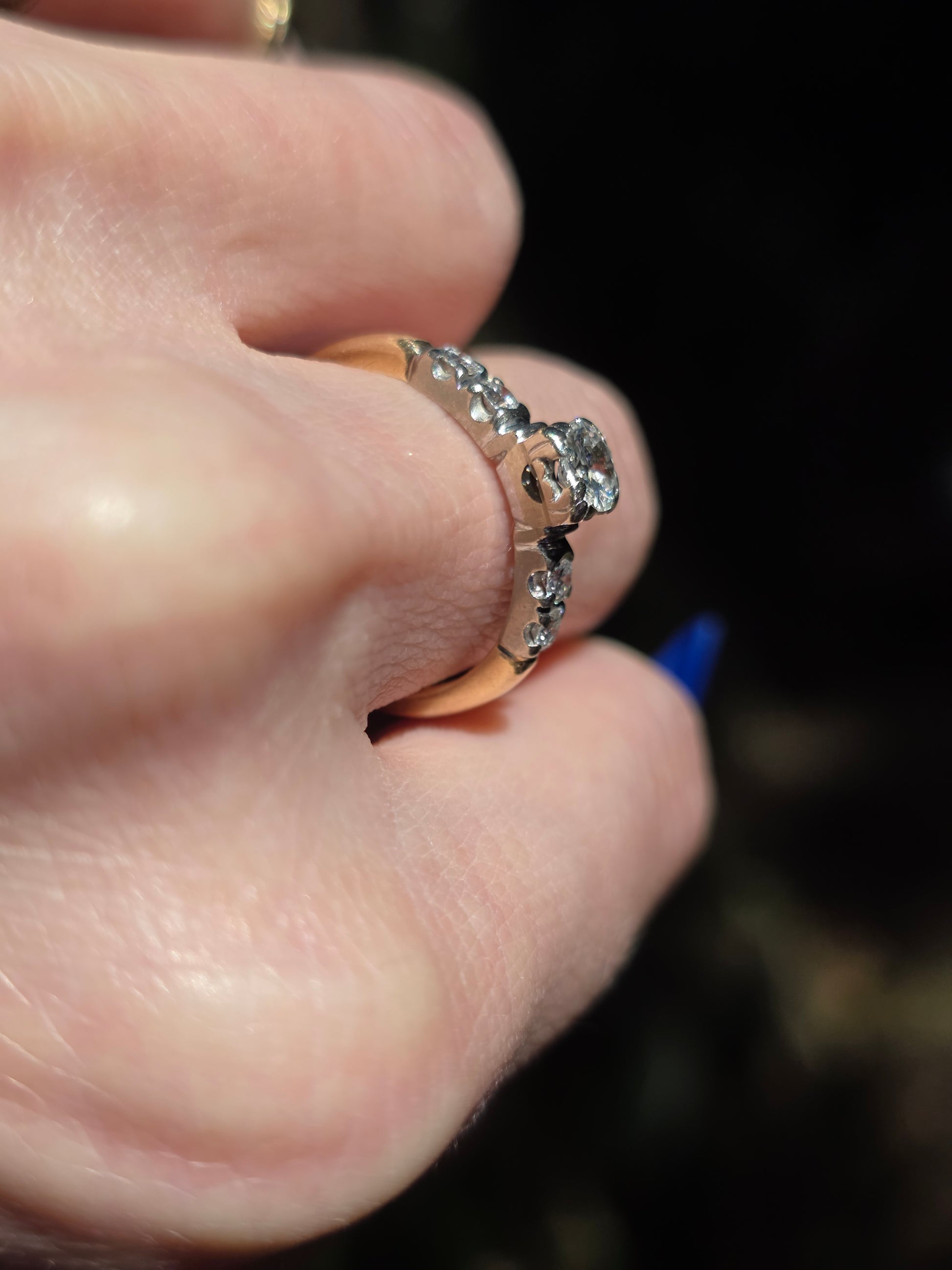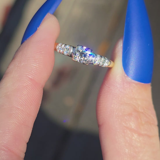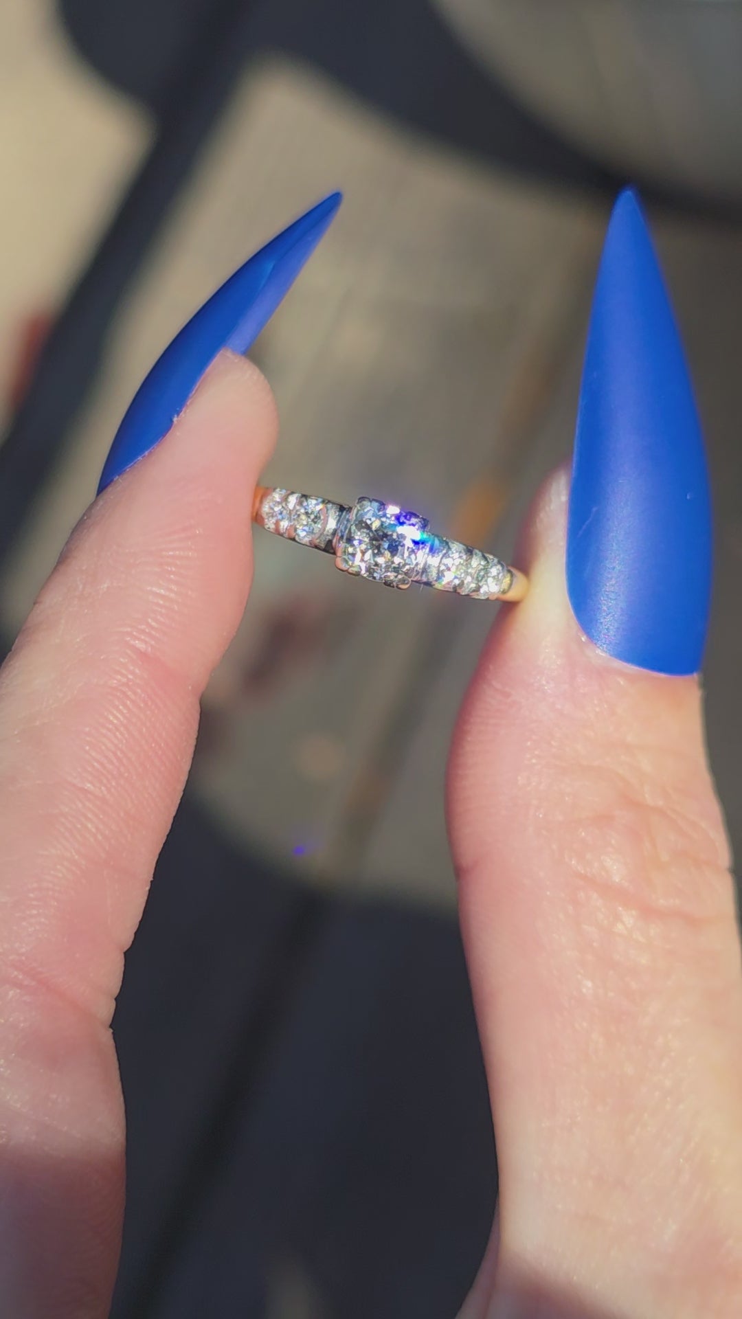 This dainty ring is crafted from 14K yellow gold and approx .35cts of beautiful rainbow throwing diamonds. The piece weights approx 2.1g. She was created c.1934 – c.1950: 1934 McGraw Ave. Detroit MI based on hallmarks.