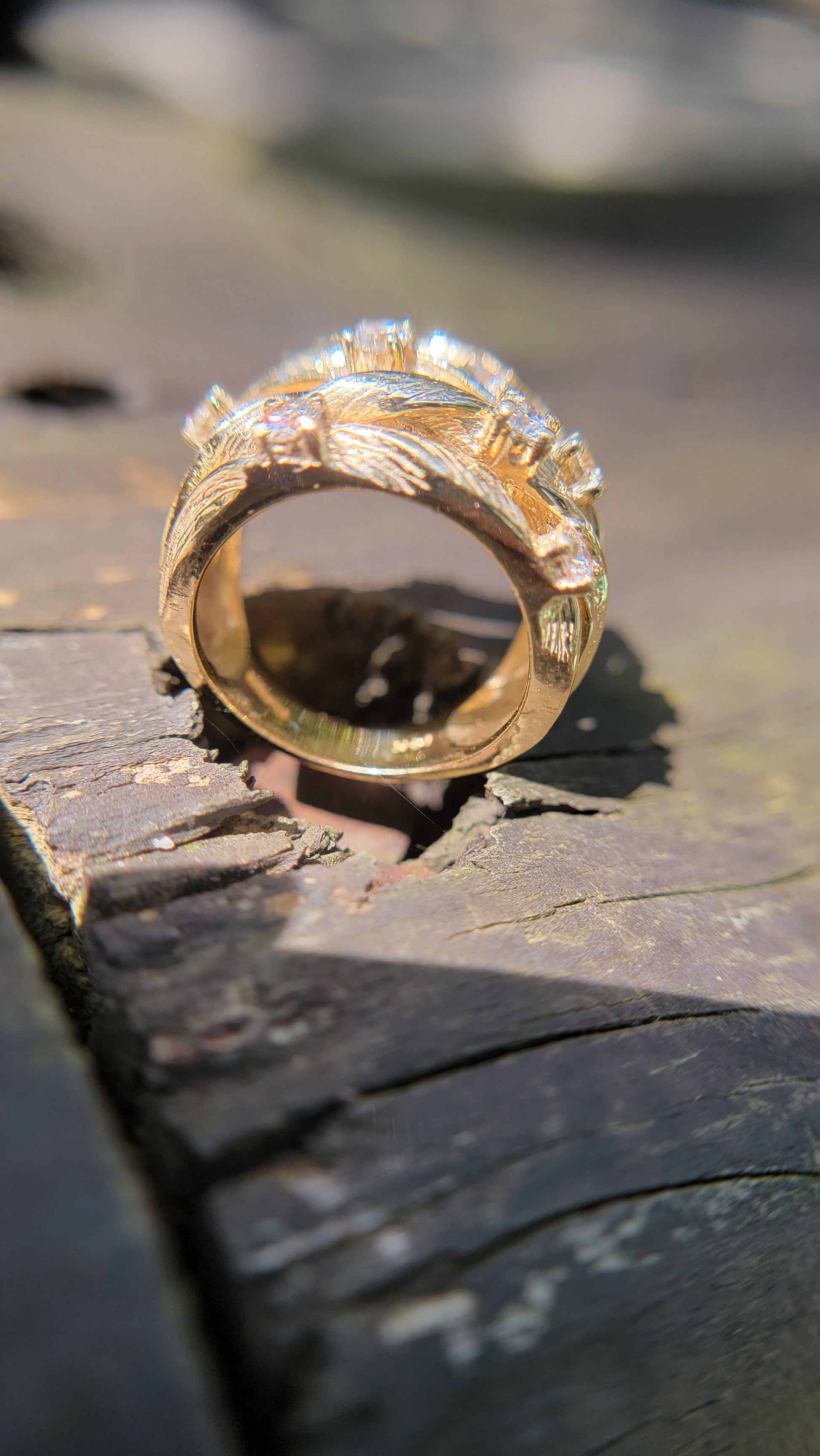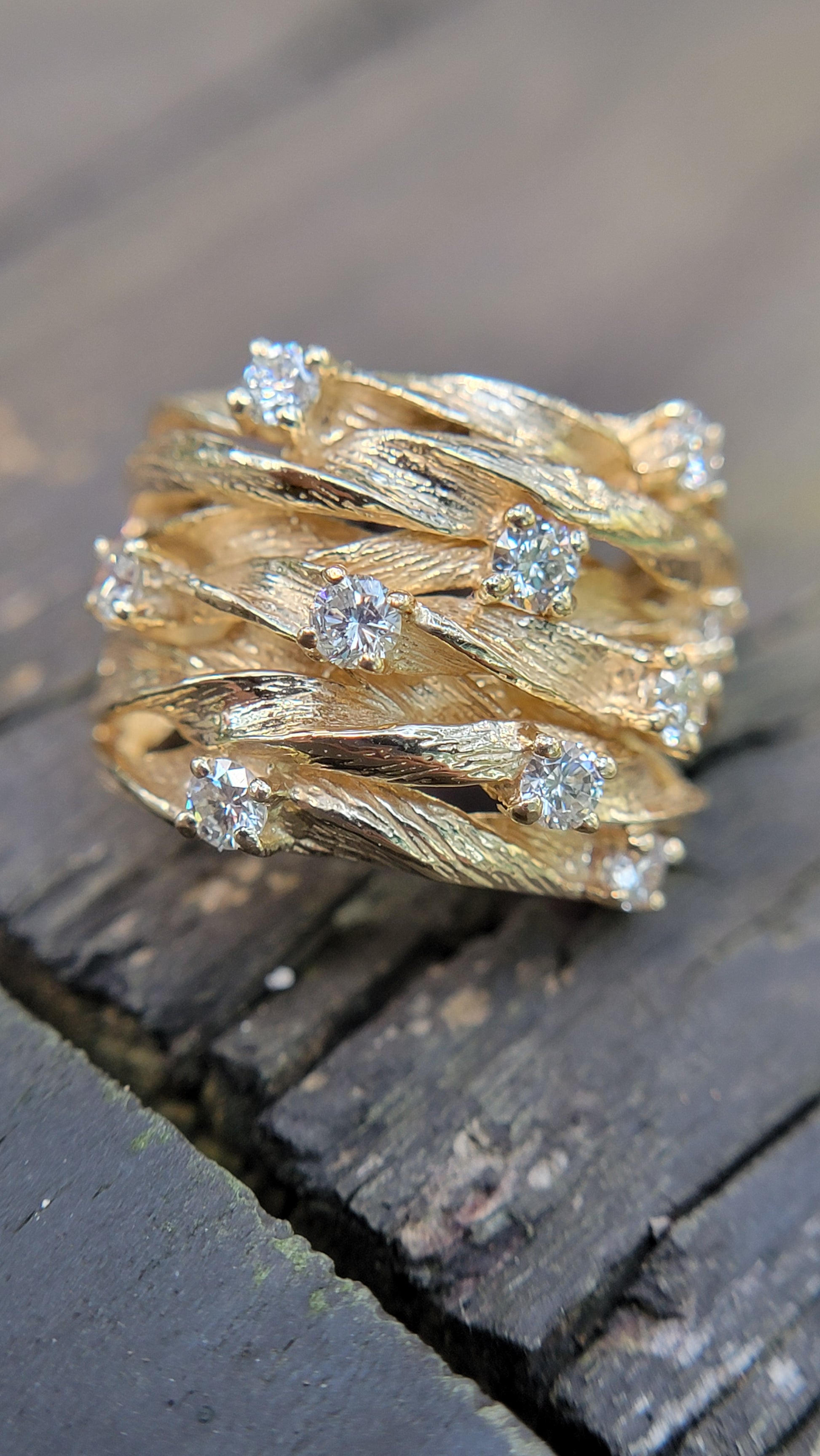 Your beautiful ring is crafted in 14k yellow gold. She features approx .95ct of stunning diamonds. She weighs approx. 13.3g.