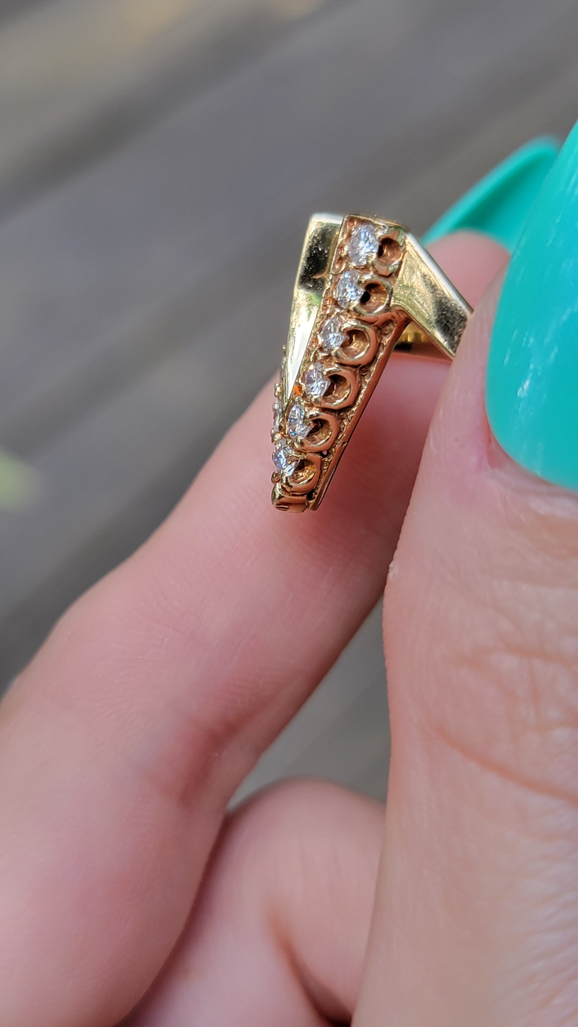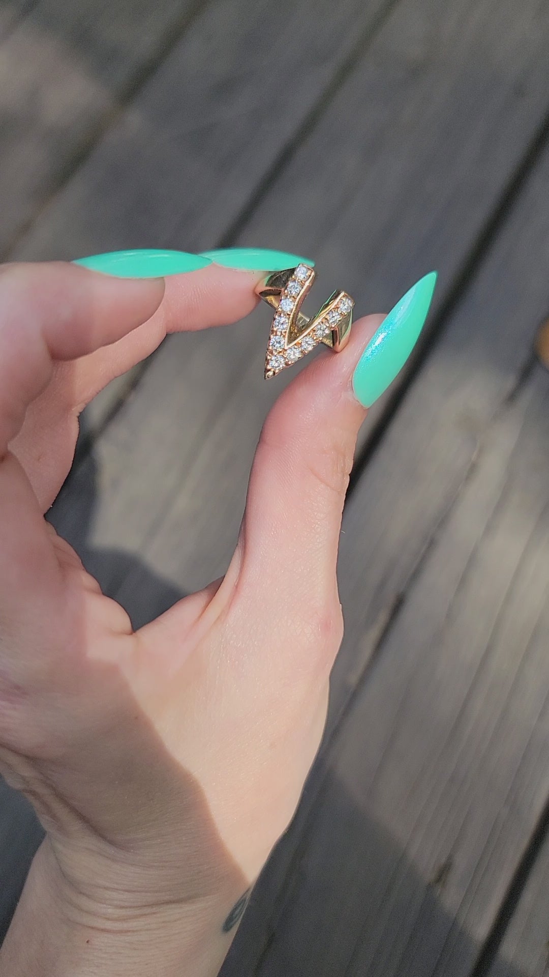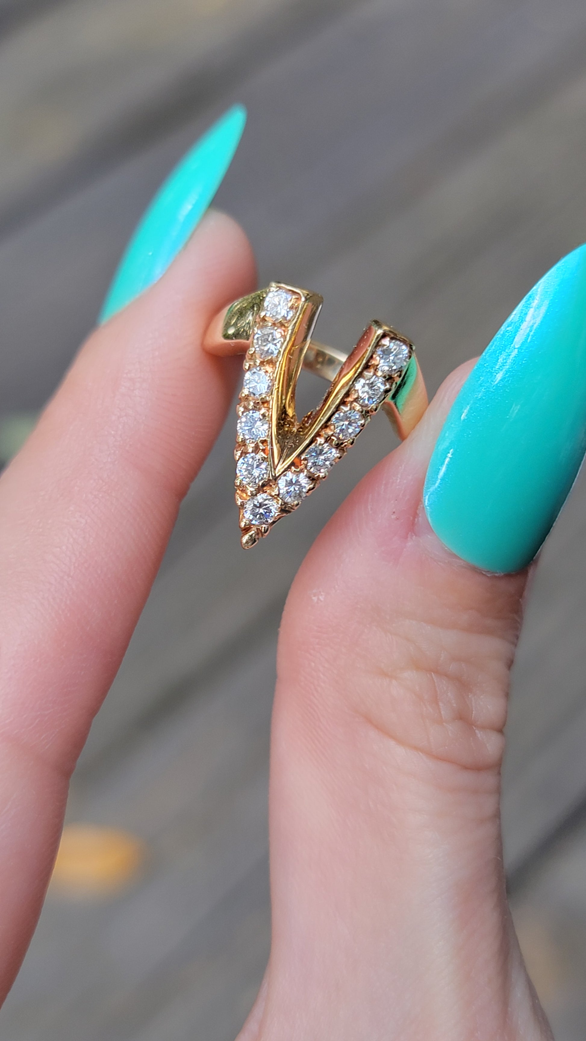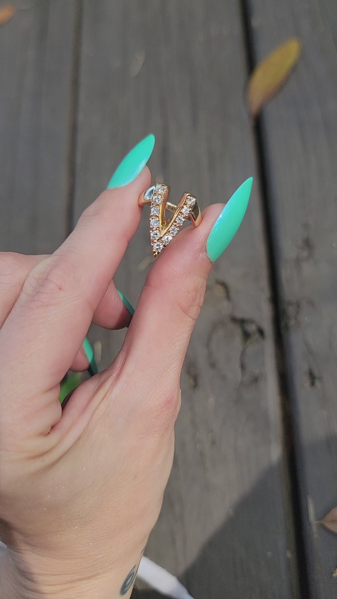 V is not for vendetta. This V can represent so many things, but flip her around and she'll crown a stack quite nicely. The 11 diamonds in this piece are absolutely gorgeous and what made her stand out. The amazing color and sparkle they produce is magical. The design of this piece doesn't disappoint from any angle. Whether you're looking to give a gift or represent your own sparkle, this piece delivers.