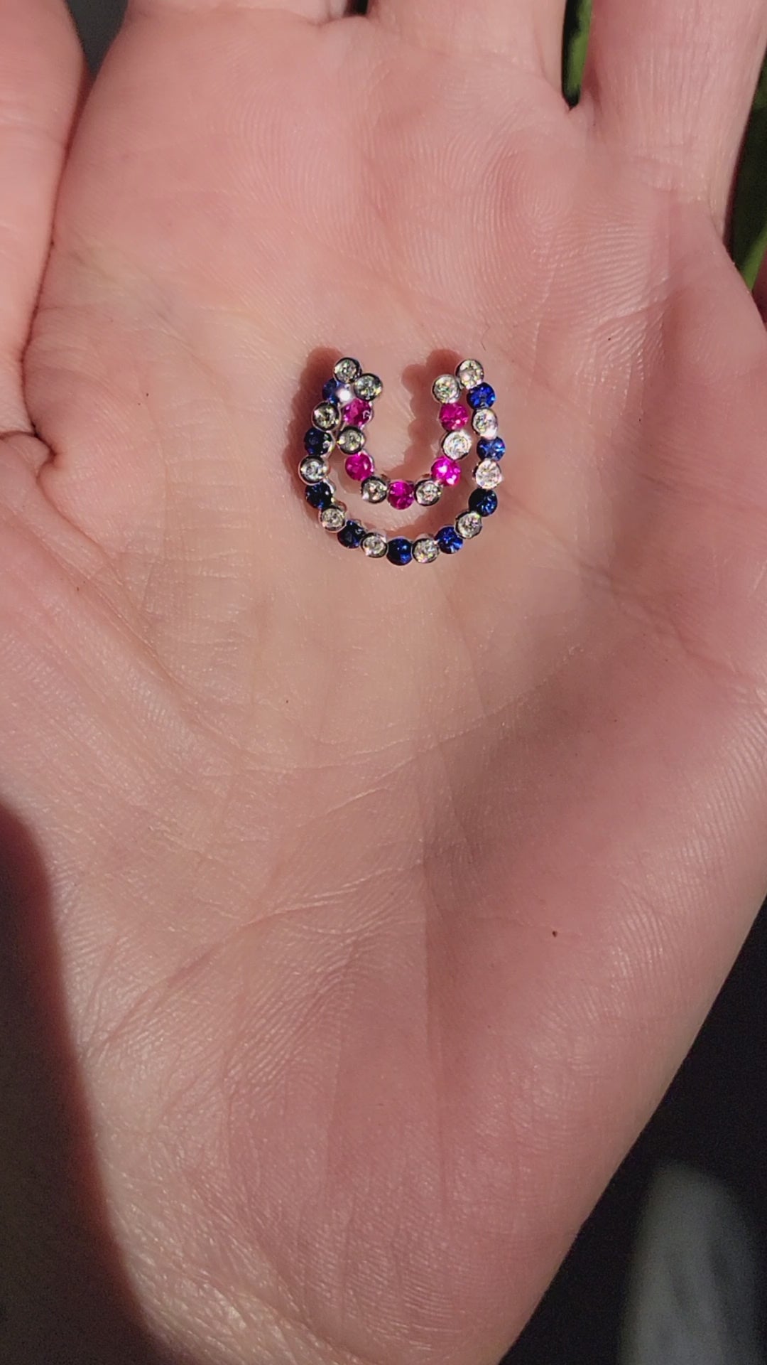Sometimes stacking your poker chips all fancy can be a challenge with one of our horseshoe rings...enter this gorgeous colorful double horseshoe pendant! The pinks and blues sparkle like the jackpot on our favorite piggy bank slot machine. The double horseshoe is made with 16 small sparkling diamonds, 9 synthetic blue sapphires, and 5 synthetic rubies. Keep your good luck horseshoes contained when you're cheering about winning big. Choose her and you're already winning!
