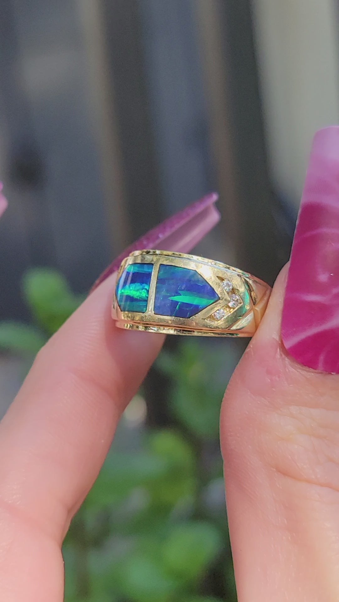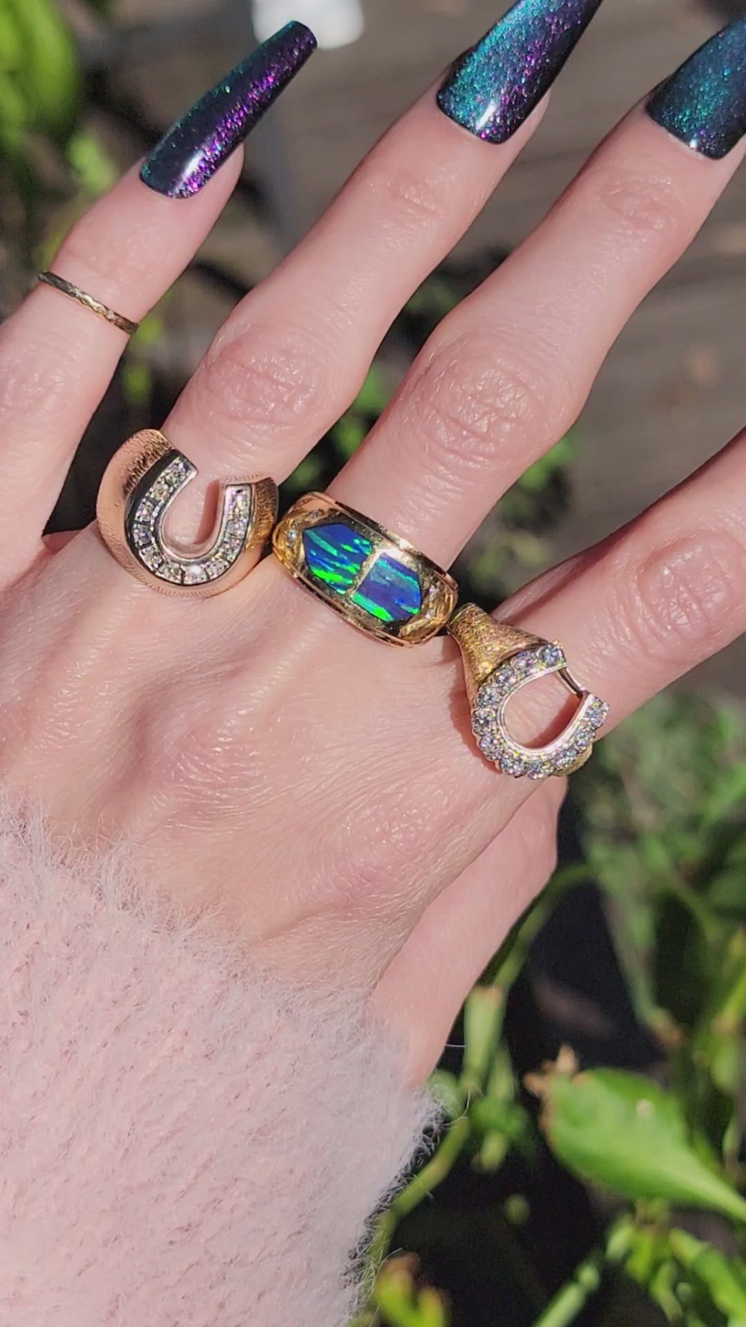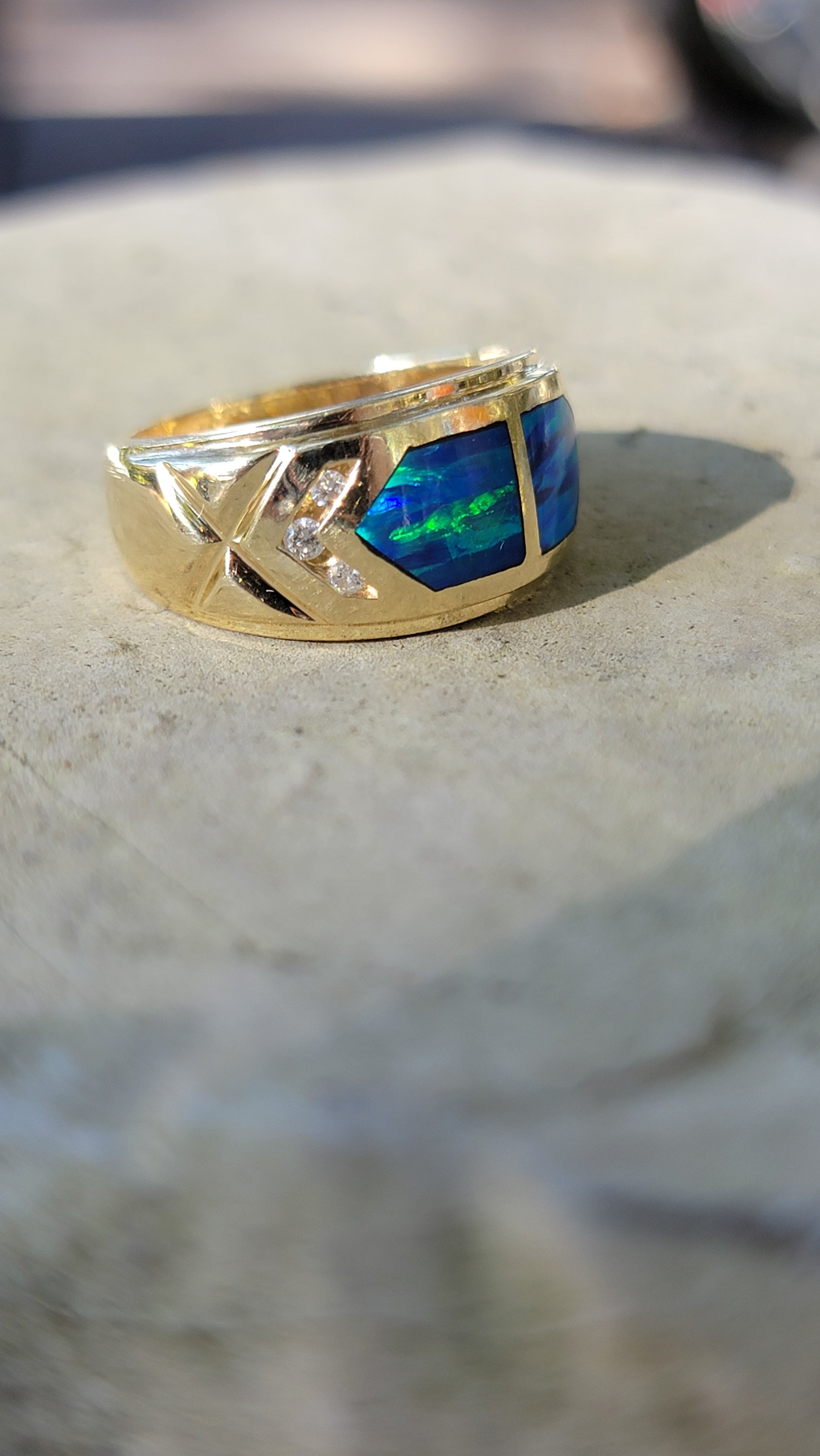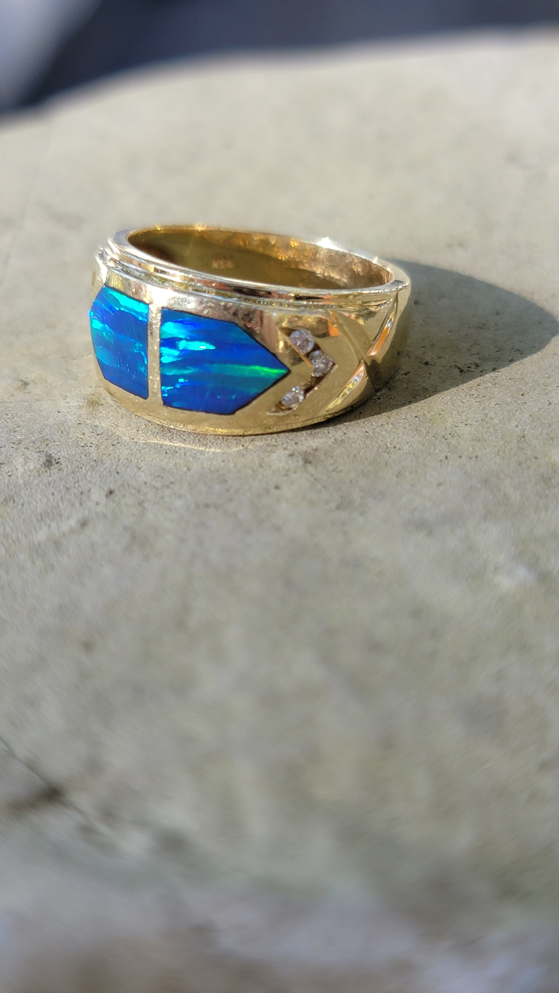 These Opals are something else. Whether you're inside or outside, you're going to find the fire in this beautiful ring. She gives us nautical vibe for sure. The blues and greens in the opals are akin to carrying a bit of the sea with you wherever you go. Diamond chevrons (approx. .06ctw) flank both opals and are underpinned by X design in the band. Whether you see the sea or southwestern flair, you certainly won't be disappointed. Don't flounder on this one, she's definitely growing legs...