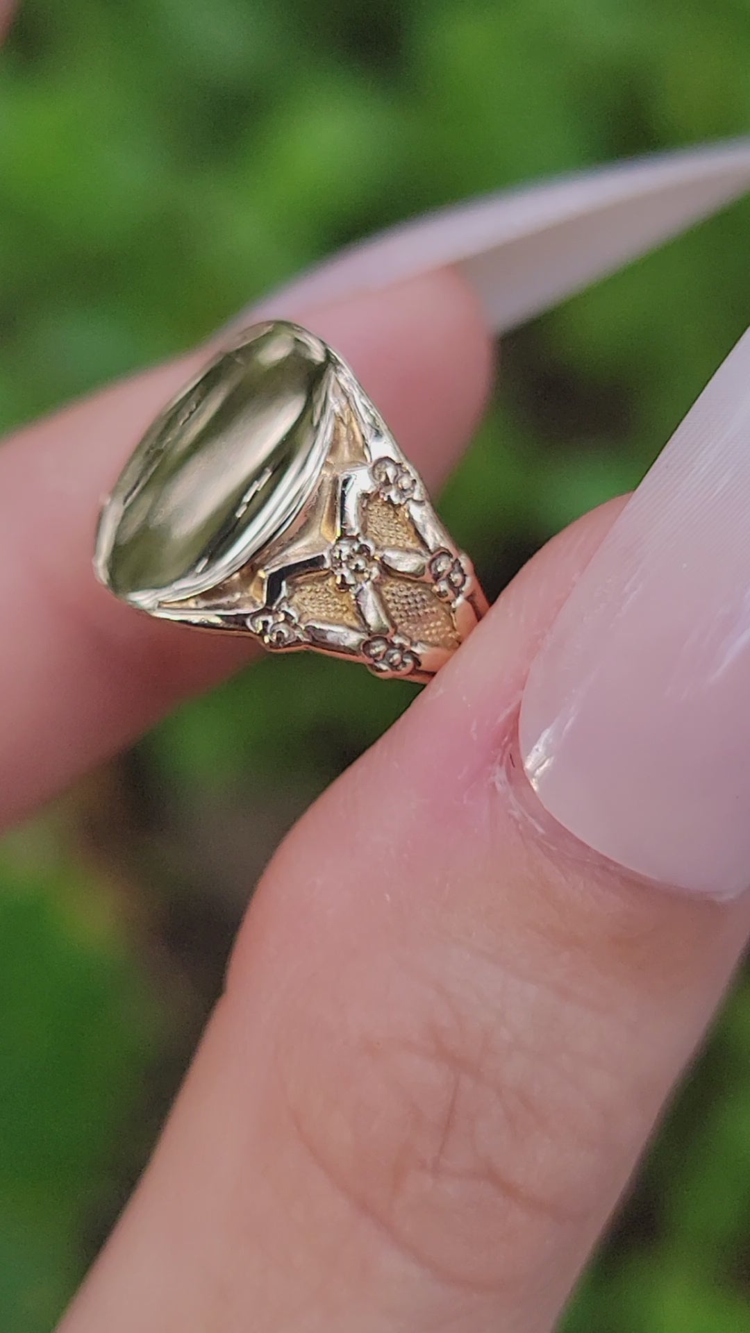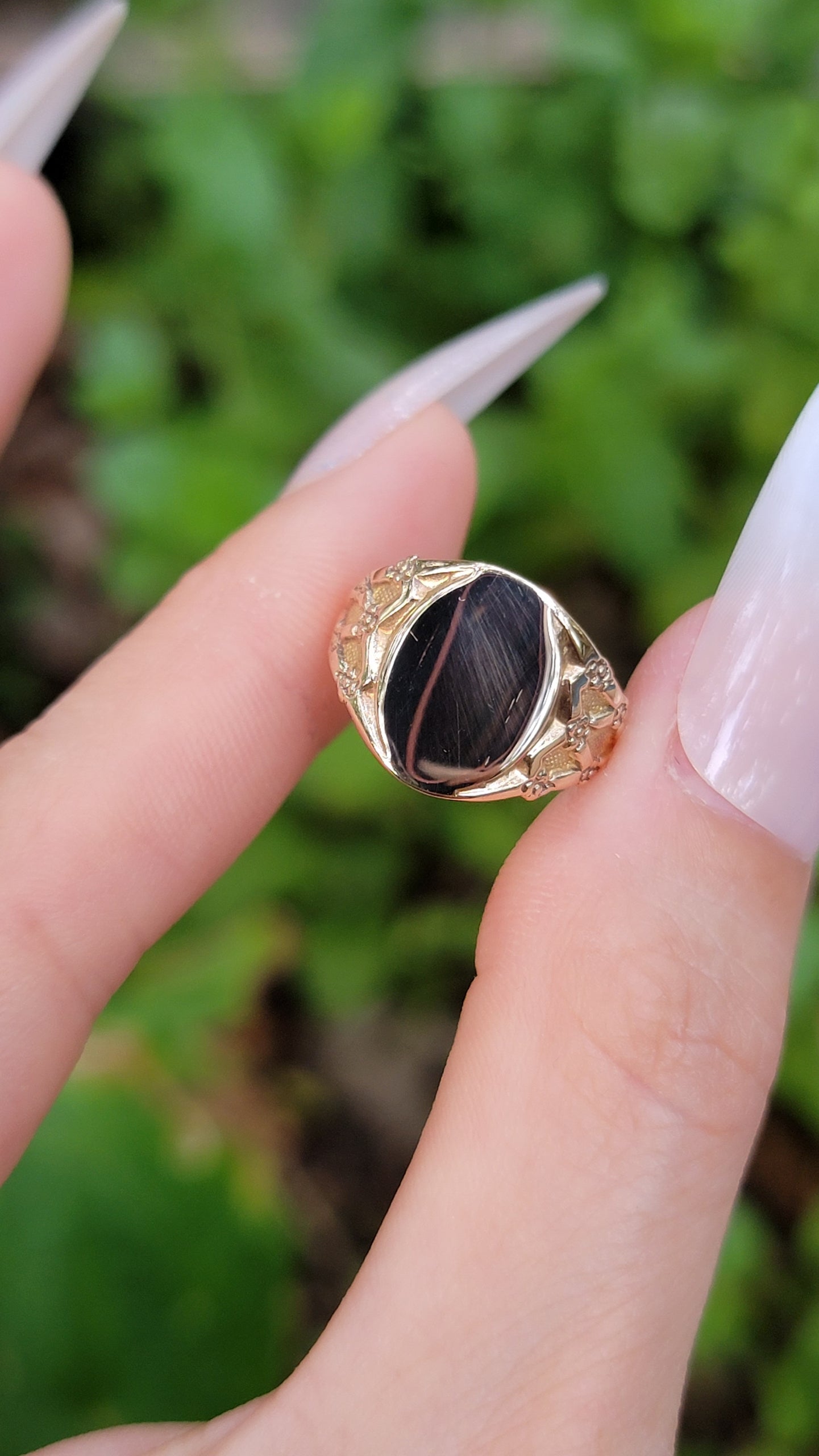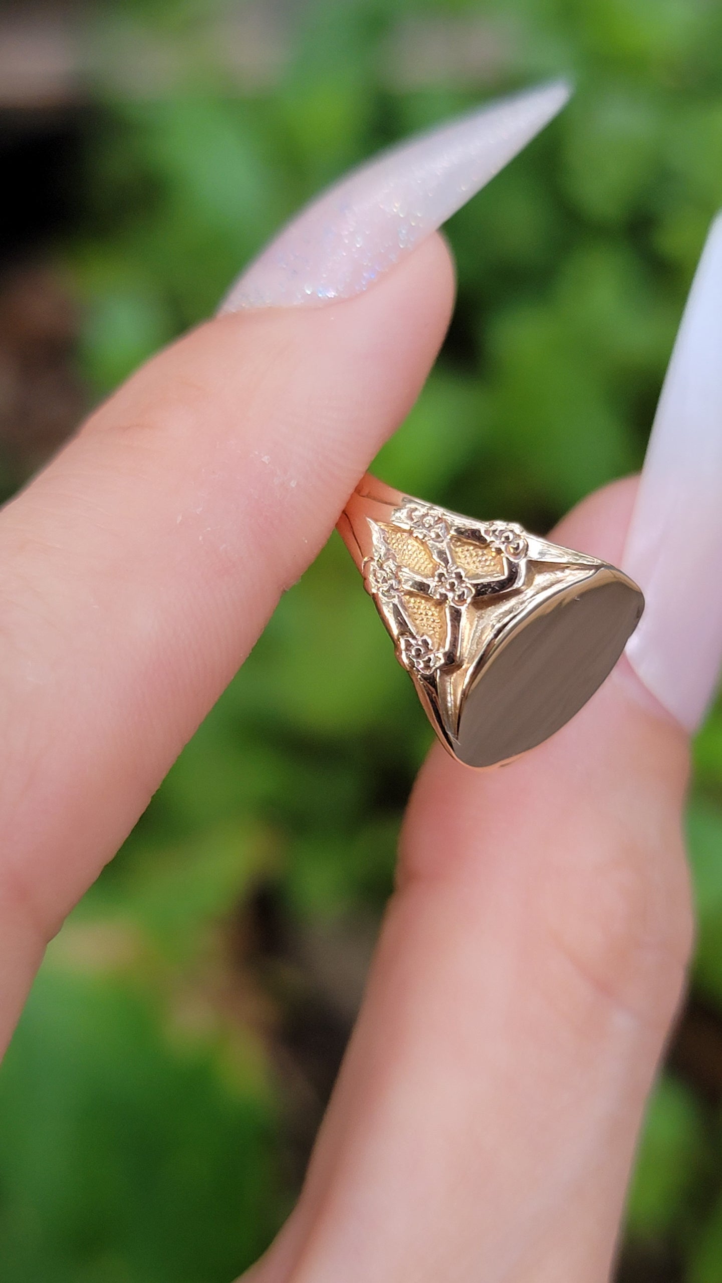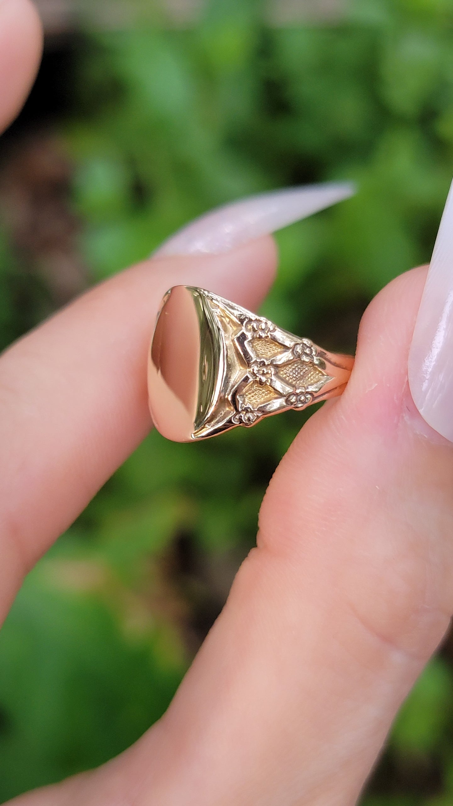 This sweet signet is monogram ready! The romantic lattice design on her shoulders is beautifully detailed with small flowers that taper into the band. There are no hallmarks present, but it has been professionally tested as 14k. Whether or not you intend to engrave this stunner, or let her mirror finish do the talking, you will not be disappointed!