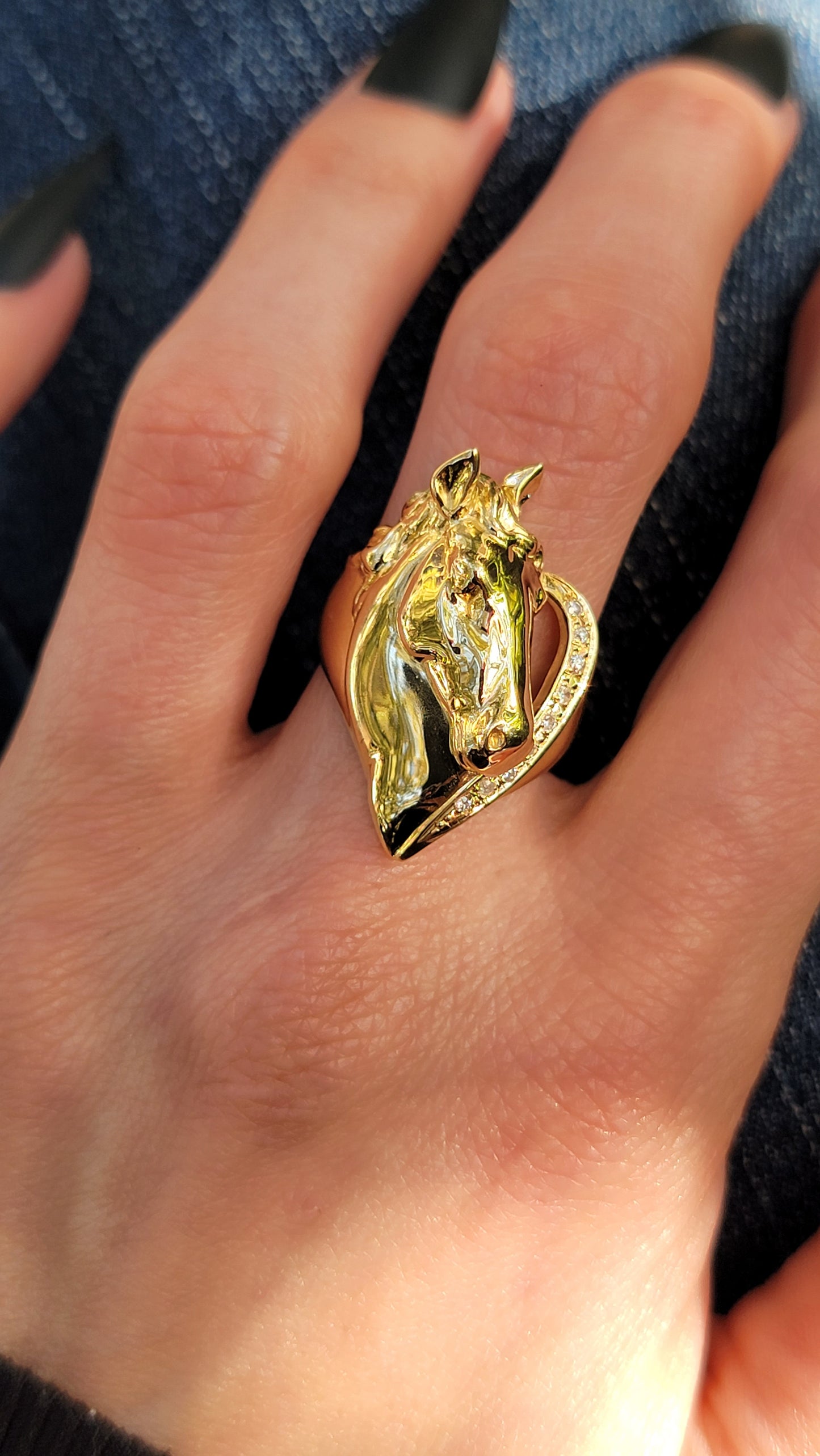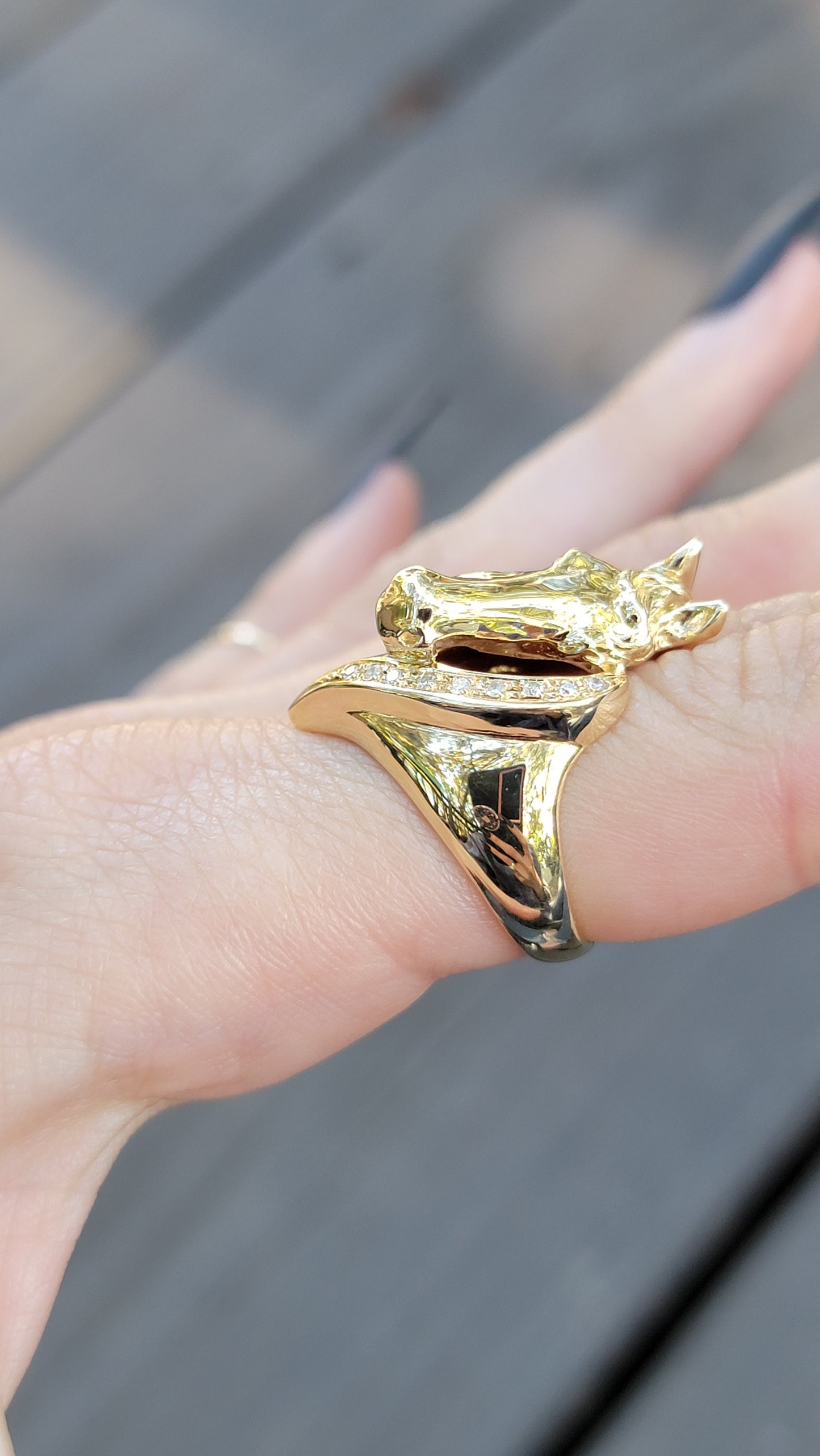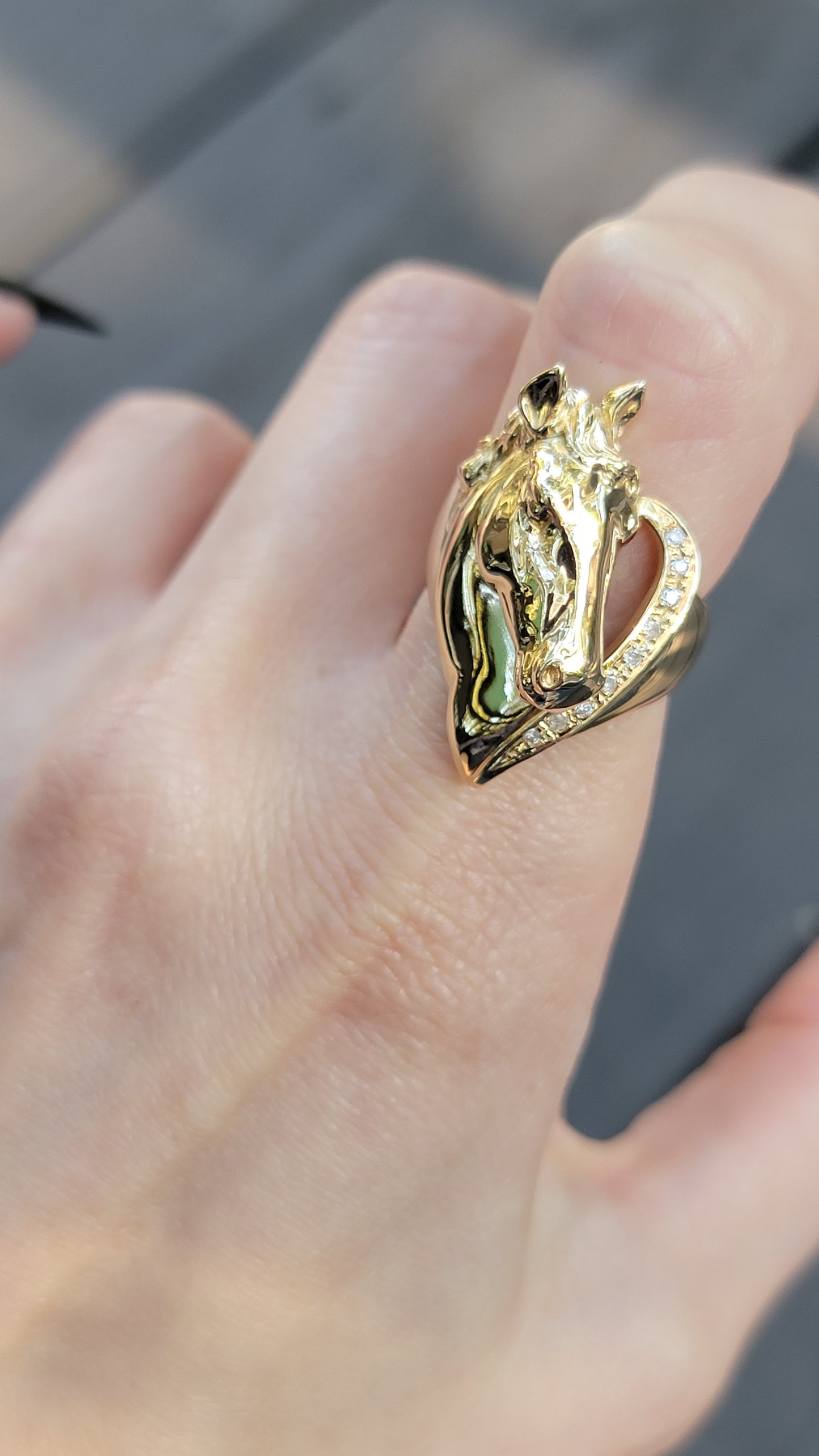 This vintage piece is crafted in stunning 18kt yellow gold and features a beautiful diamond garland because this beauty won the race for our hearts. Don't miss your opportunity to add this figural piece to your collection. She won't last long.