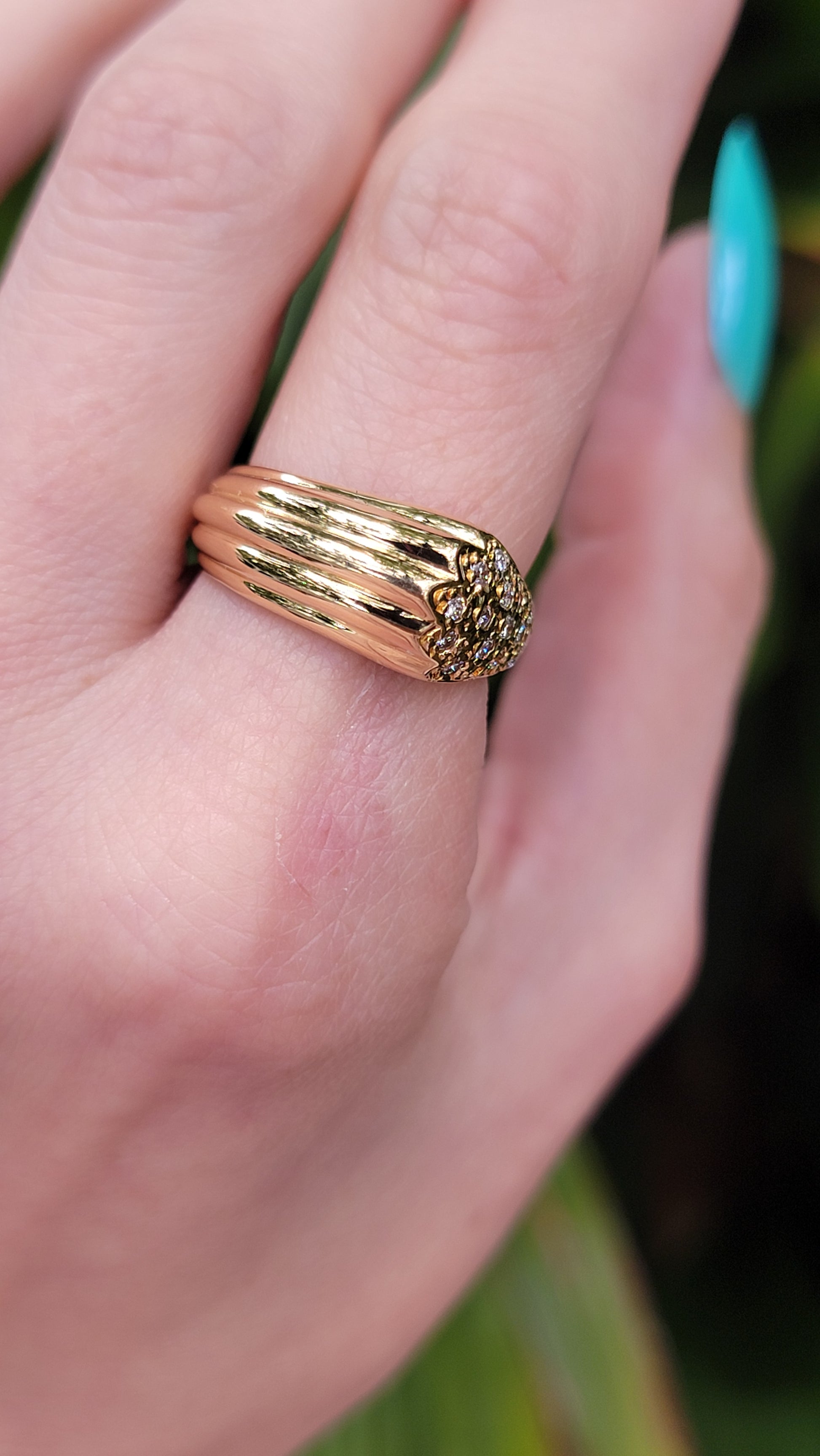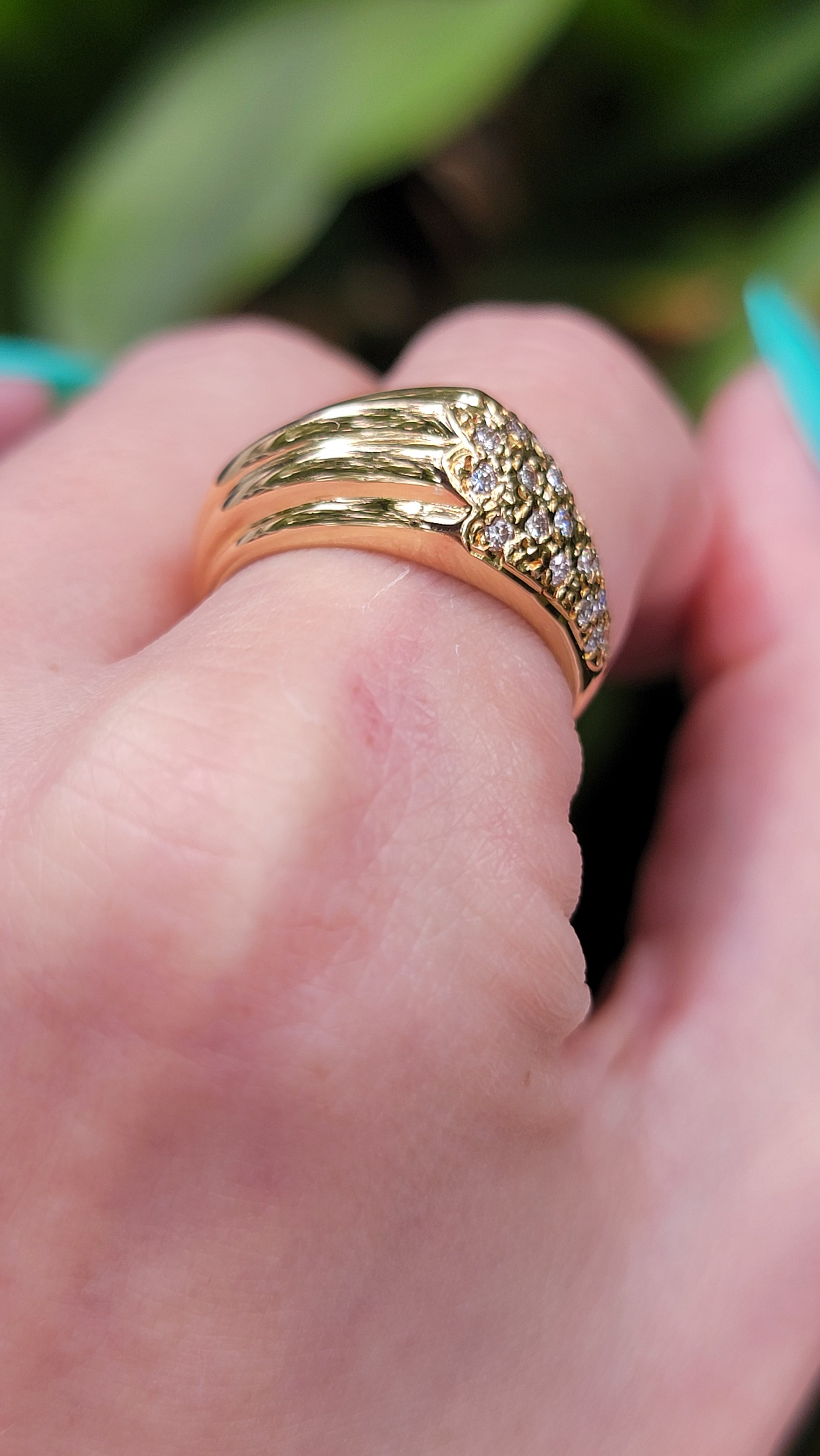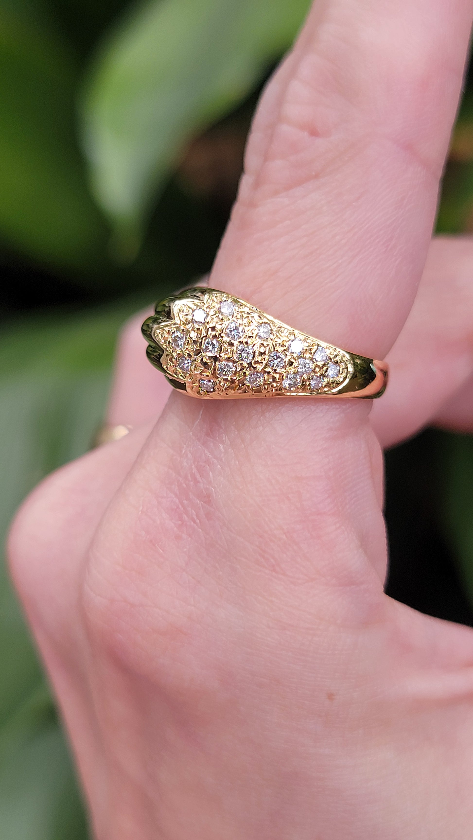 Your beautiful diamond wave signet is crafted in 18k yellow gold. She features approx .27ct of sparkling diamonds. She weighs approx. 7.5g.