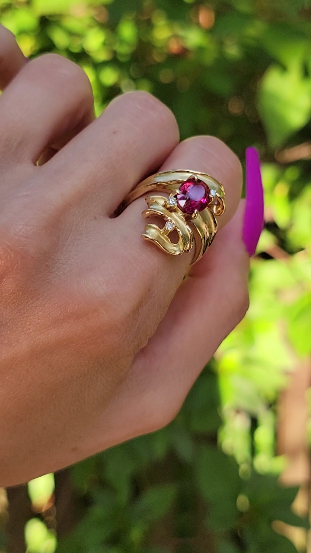 This vintage ring brings me back to my childhood. Ribbon dancers were one of my favorite activities ever! This unique ring features both polished and matte finished 18kt yellow gold that really highlights the joyous movement of the piece. This dancer weighs in at approximately 9.6 grams. She features an incredibly vivid 1.9ct (approx) Pink Tourmaline in the center. You will also fine approximately .08ct of diamonds incorporated into the piece to draw in your eyes. I don't know about you, but we're suckers for nostalgia and this piece is floating in it. This is ring definitely better than Crystal Pepsi, but will likely be even more short lived. Don't miss out!