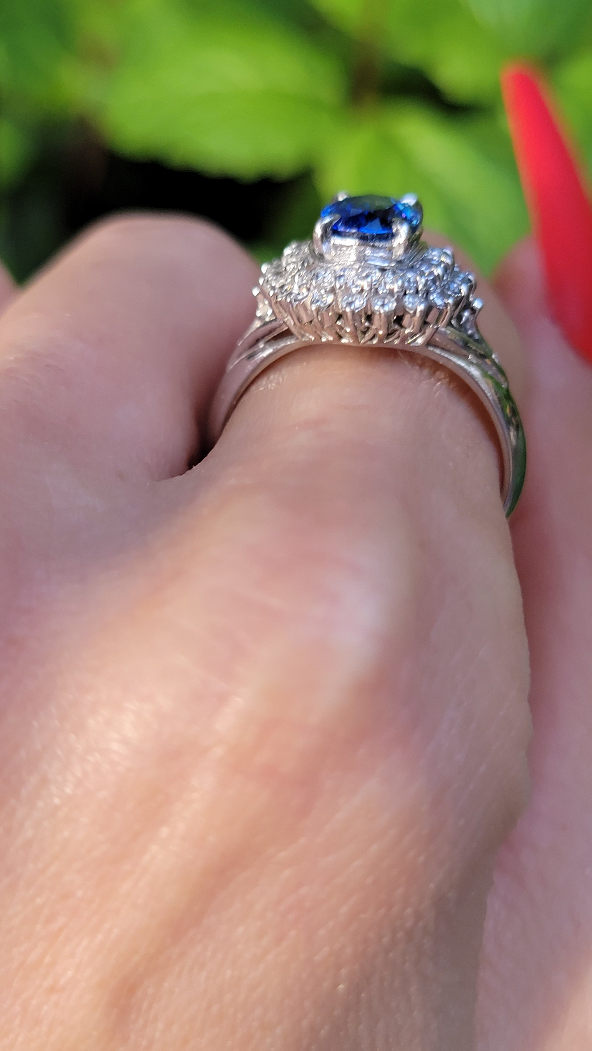 Material and Design: 6.4g Platinum, 1.47ct Blue Sapphire, and .38ct Diamonds. All weights are approximate.