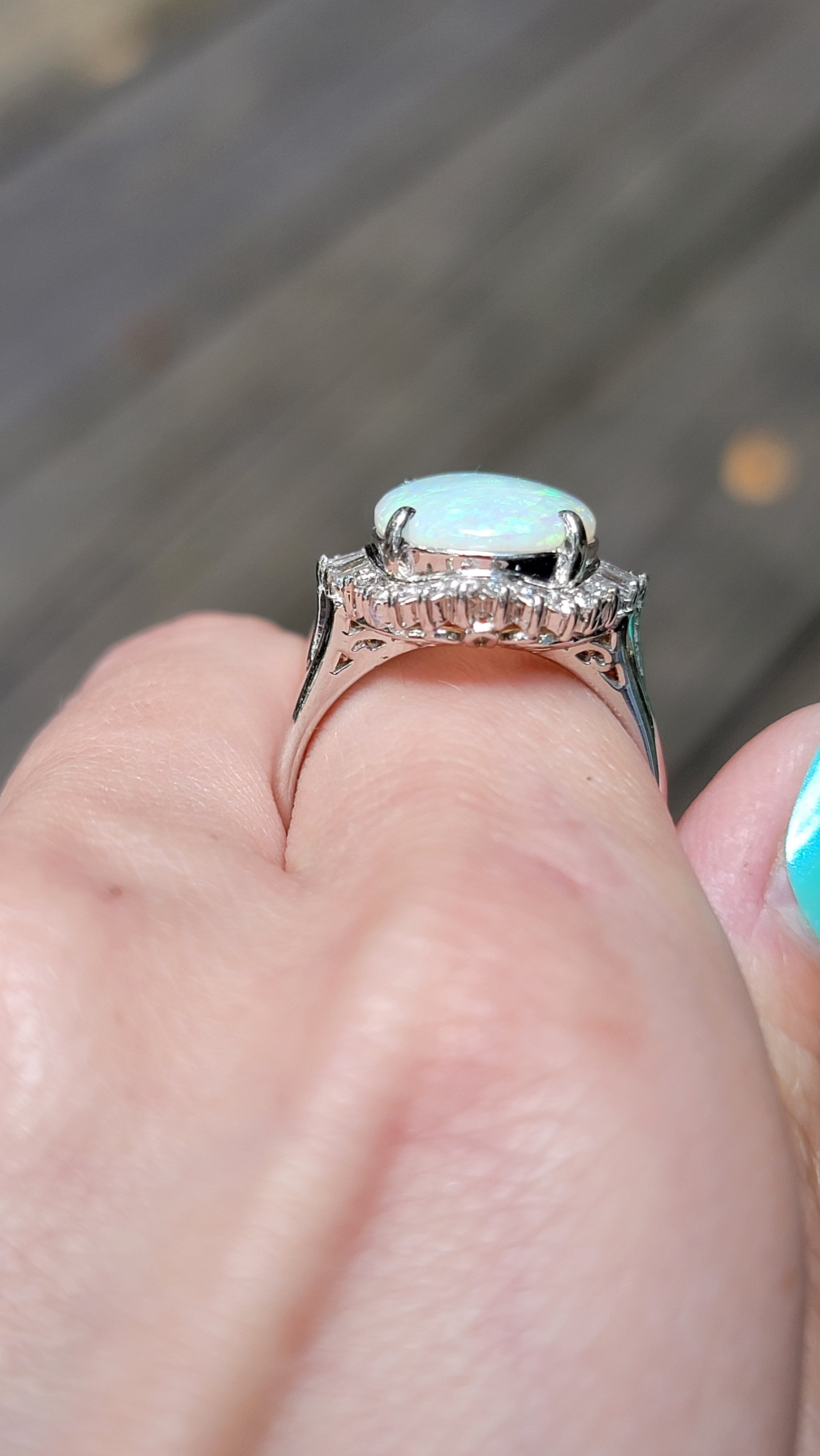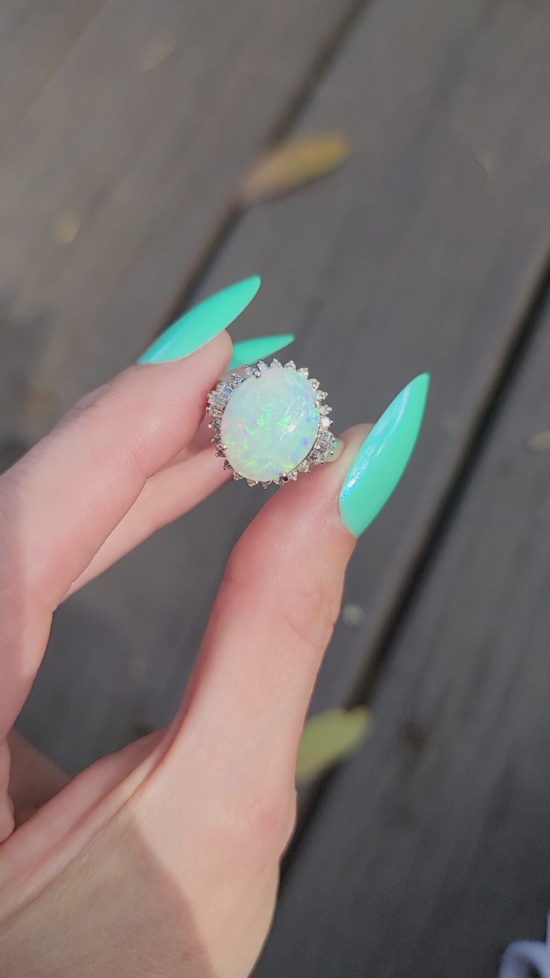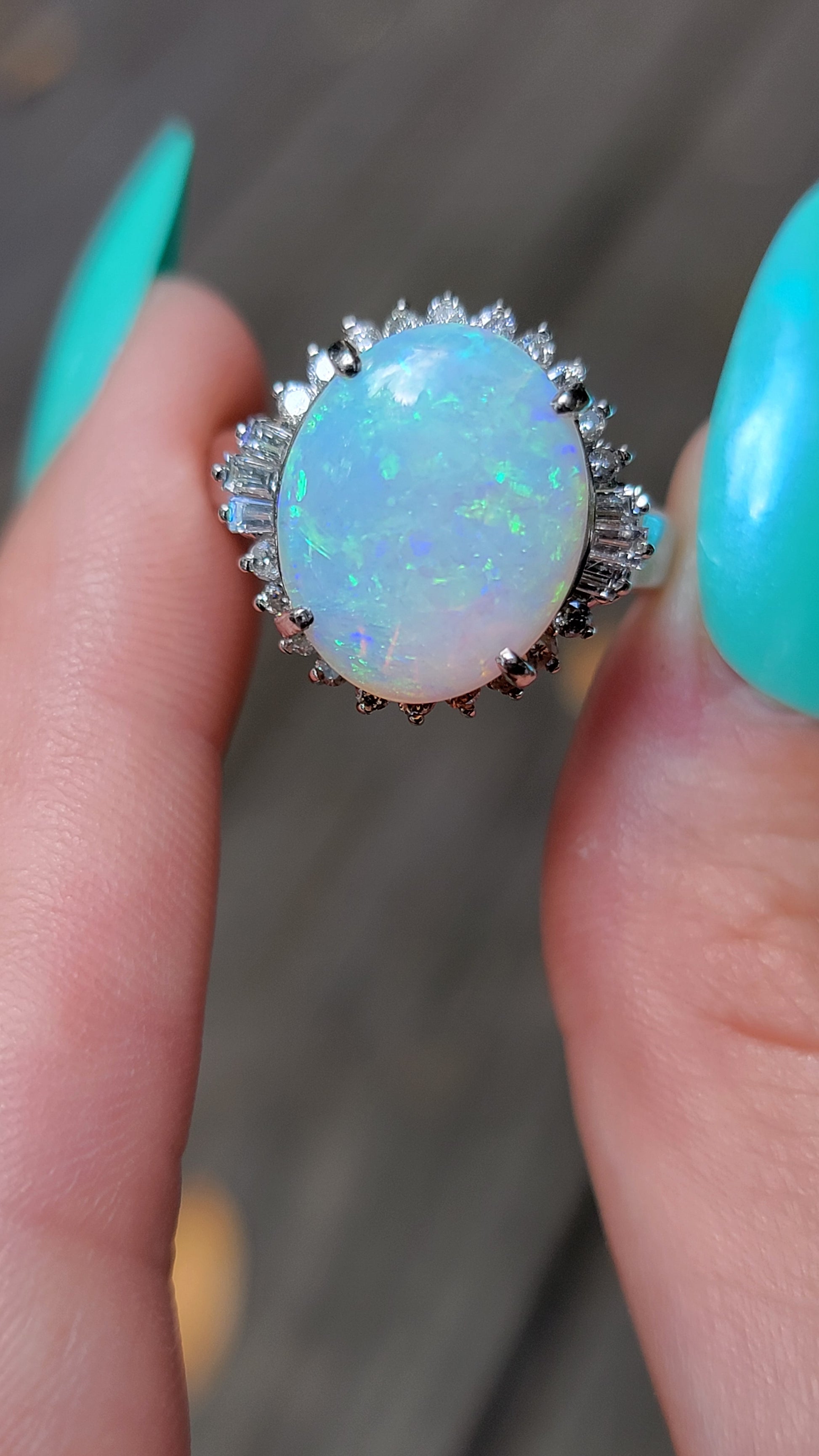 She's got a little baby tutu! I'm always a sucker for a ballerina and this colorful babe didn't disappoint. The colors in her opal reminded me of the most beautiful colorful confetti fluttering endlessly in the sun. Sometimes sun can be a bit too intense and wash out some opals, but this one truly shines in natural light. Platinum, diamonds, AND opal...don't tempt me with a good time. Your dancing partner is waiting!