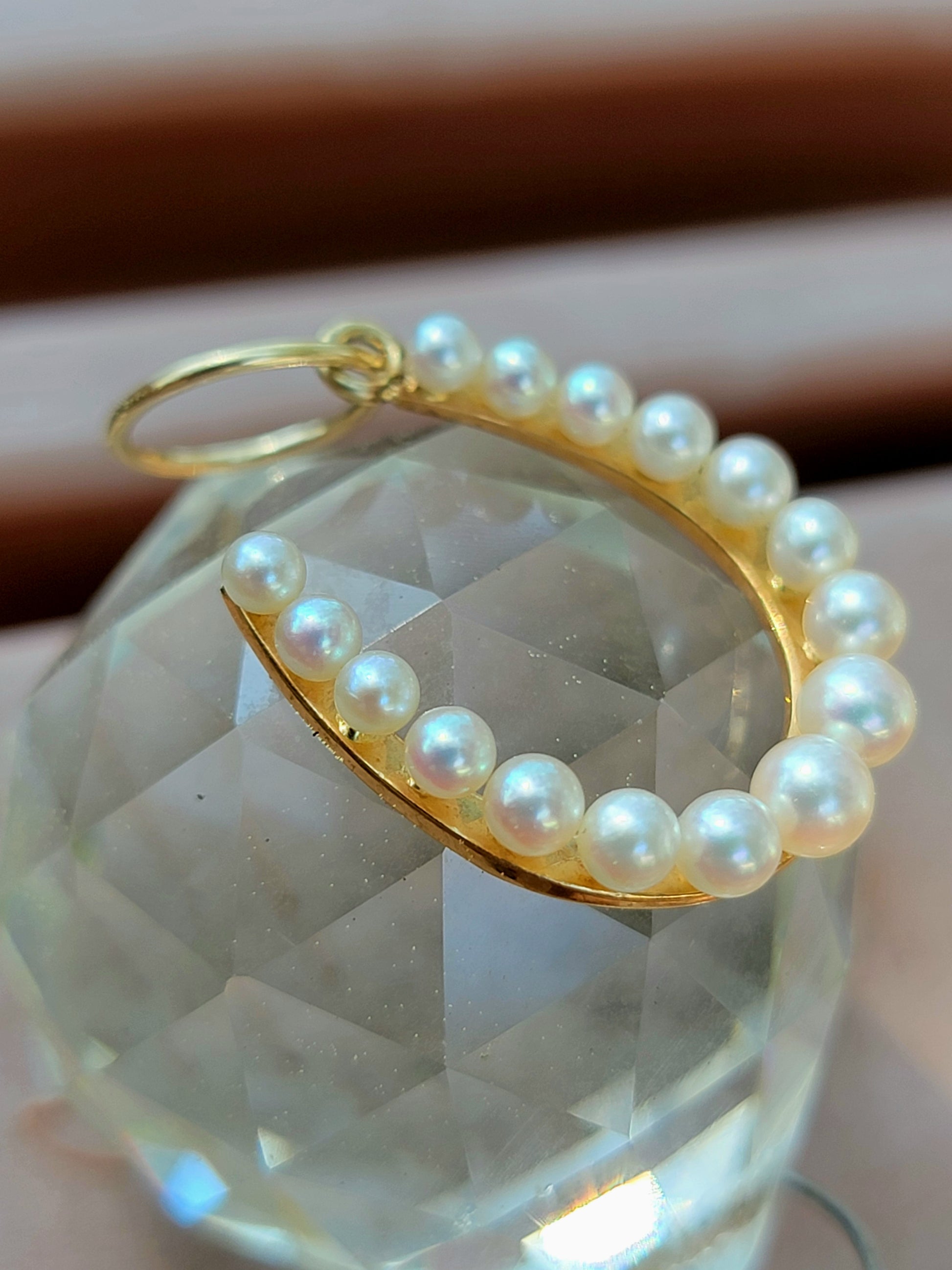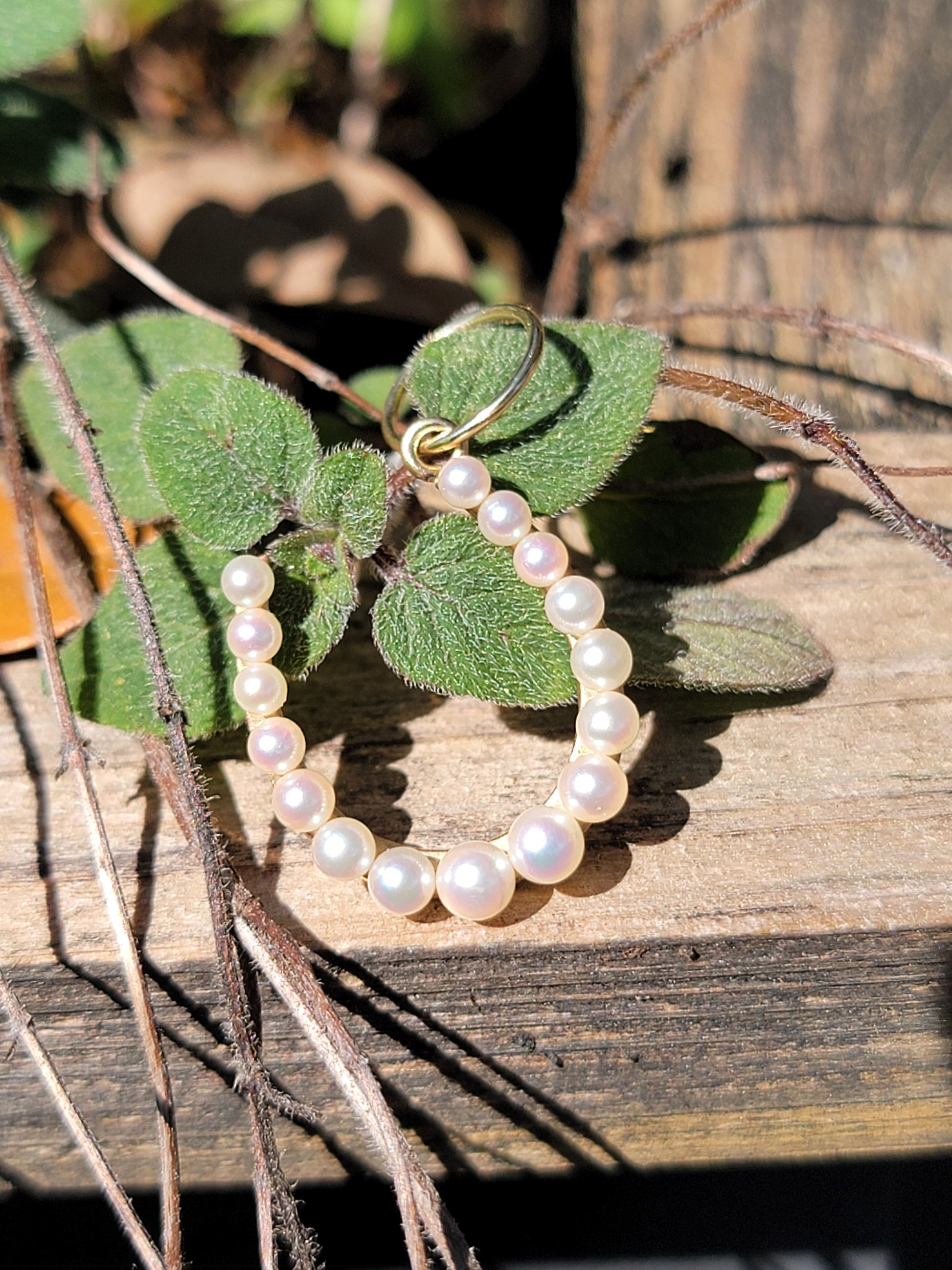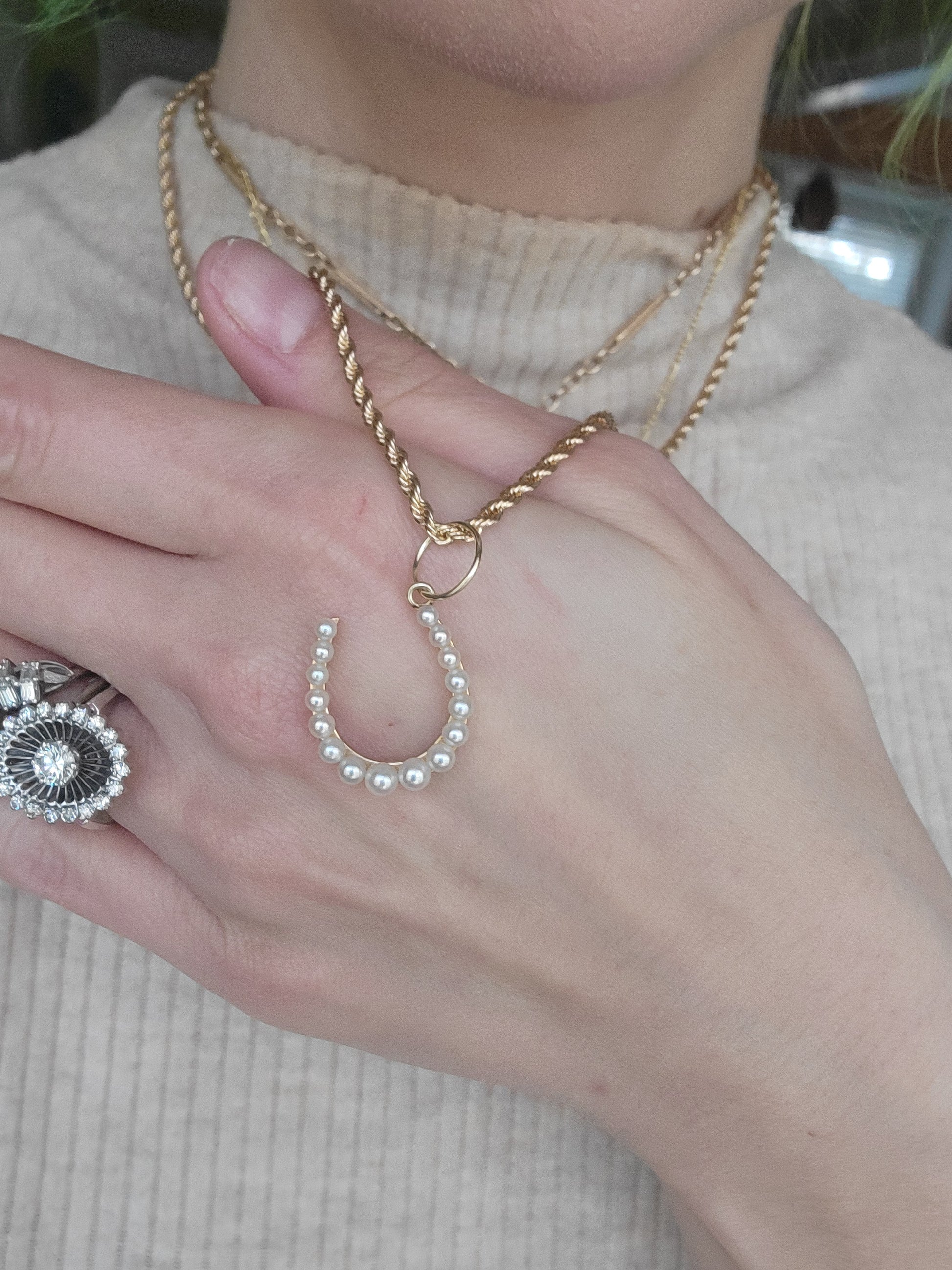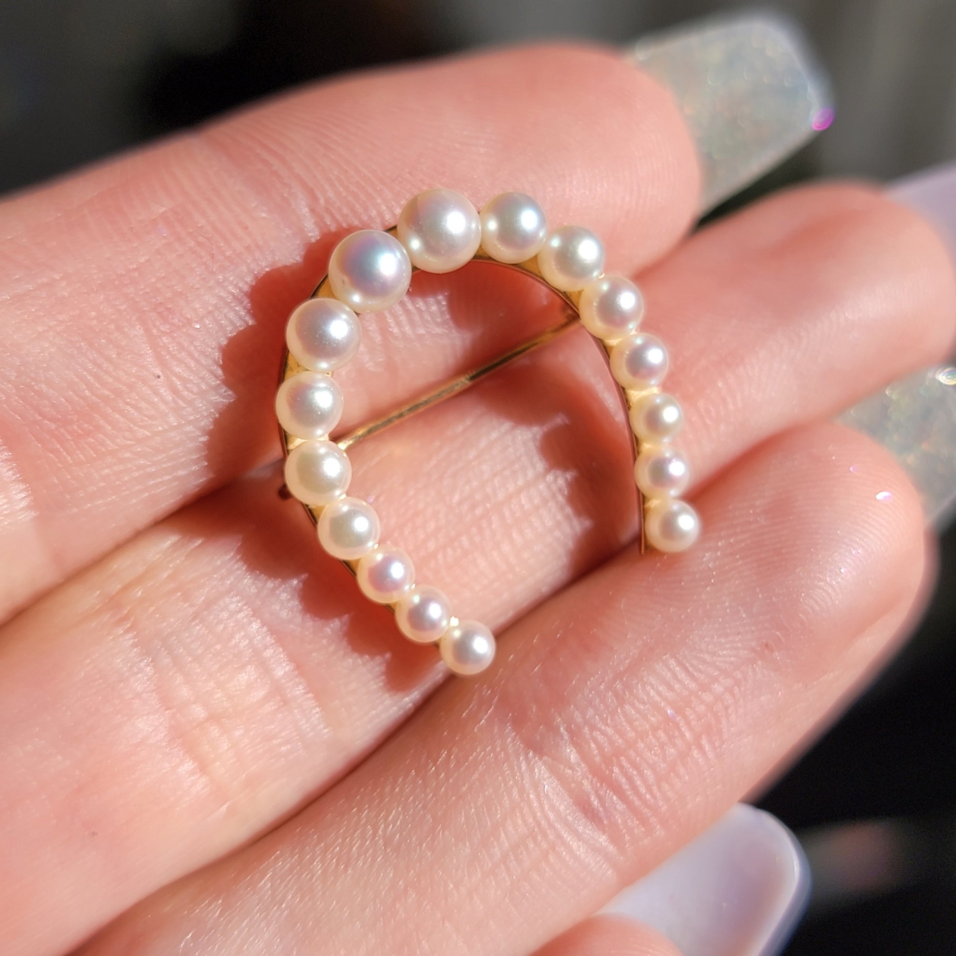 This stunning vintage brooch to charm conversion is a true treasure for any jewelry collection. Crafted from 14kt yellow gold, it features a charming horseshoe design adorned with lustrous natural pearls and a very generous, oversized jump ring for your layering chain pleasure. The delicate pearls shimmer and shine with an iridescence that catches the light and draws the eye.