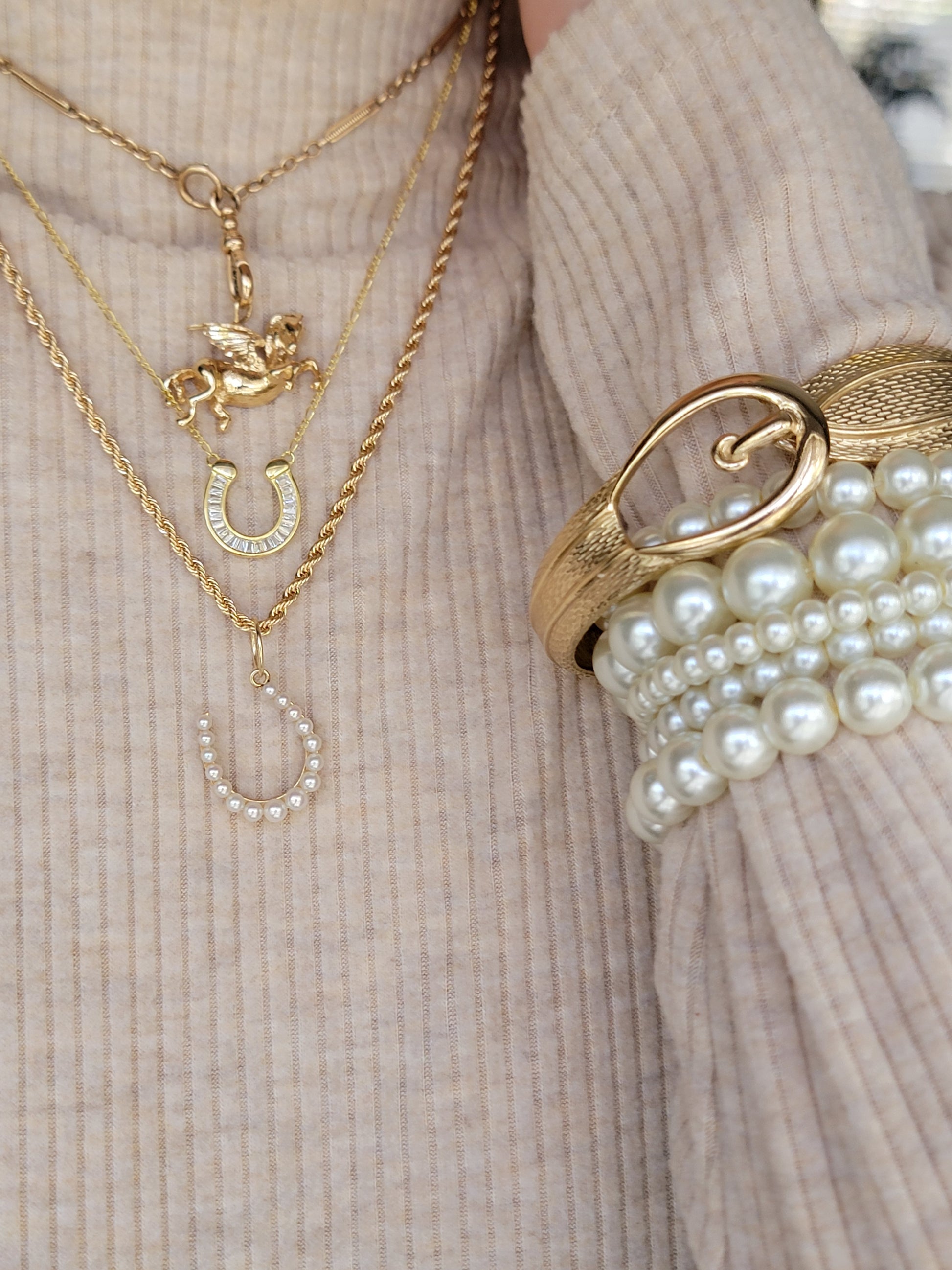 The horseshoe, a symbol of good luck and protection, is beautifully detailed with a textured surface and polished edges. The combination of the horseshoe and pearls creates a sophisticated and elegant look.