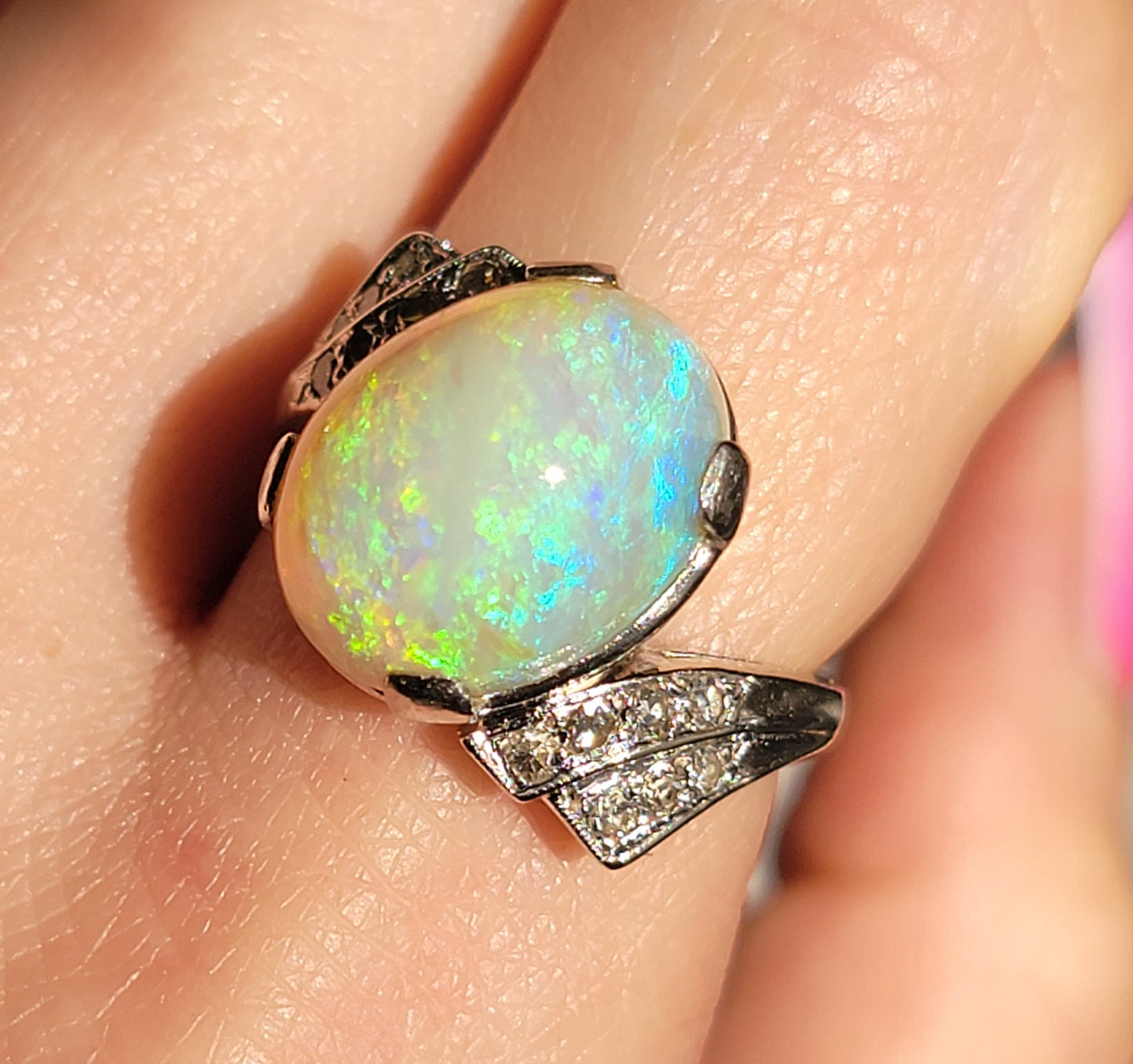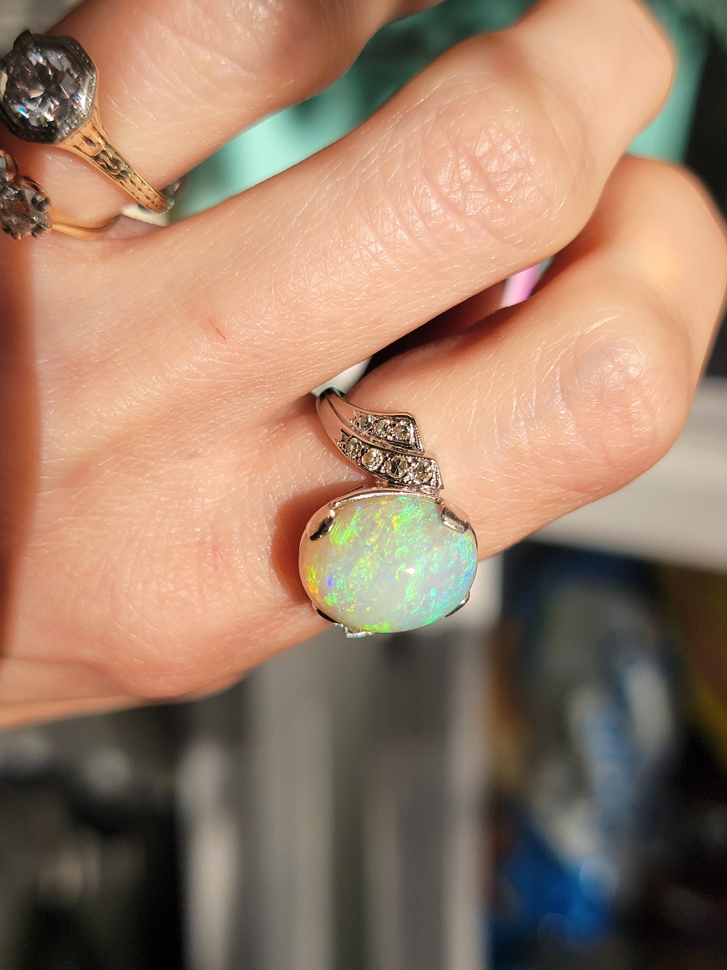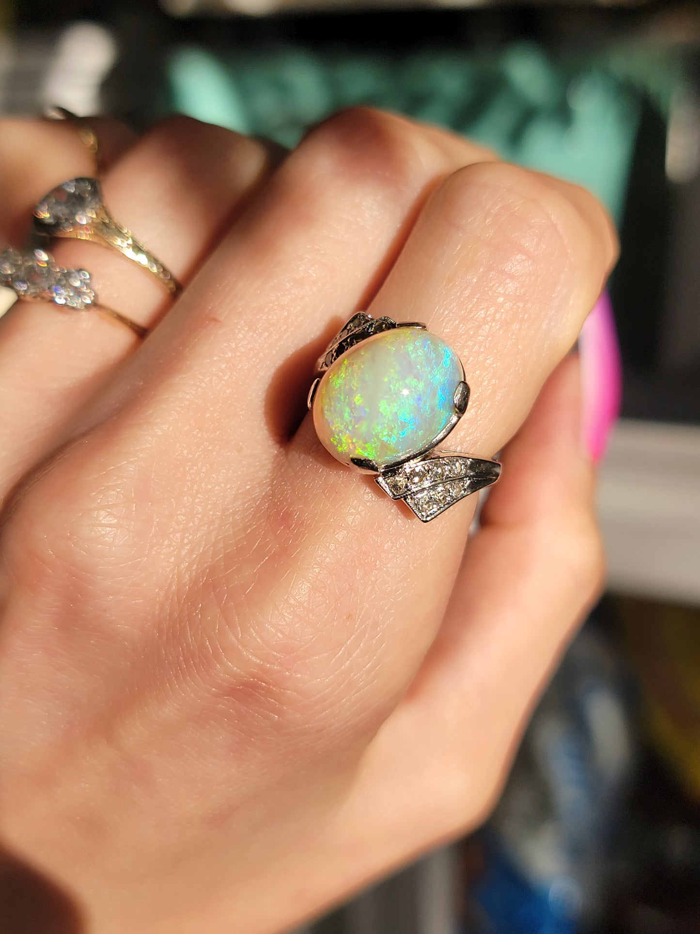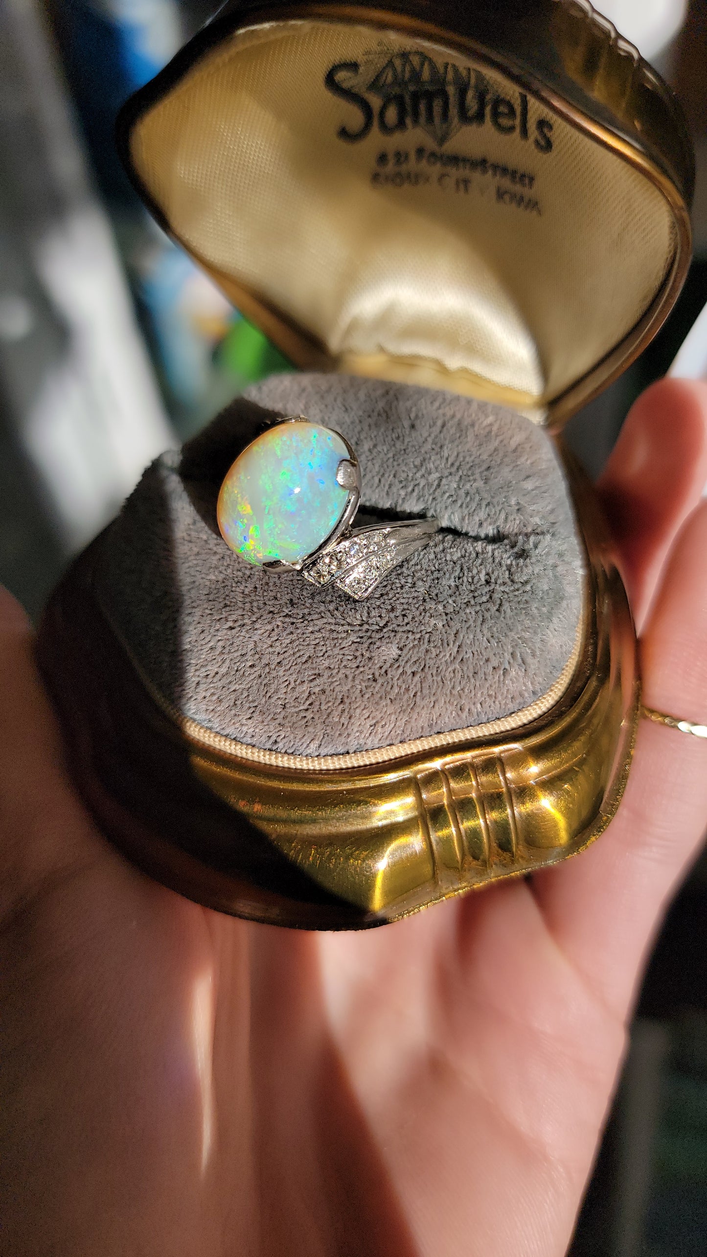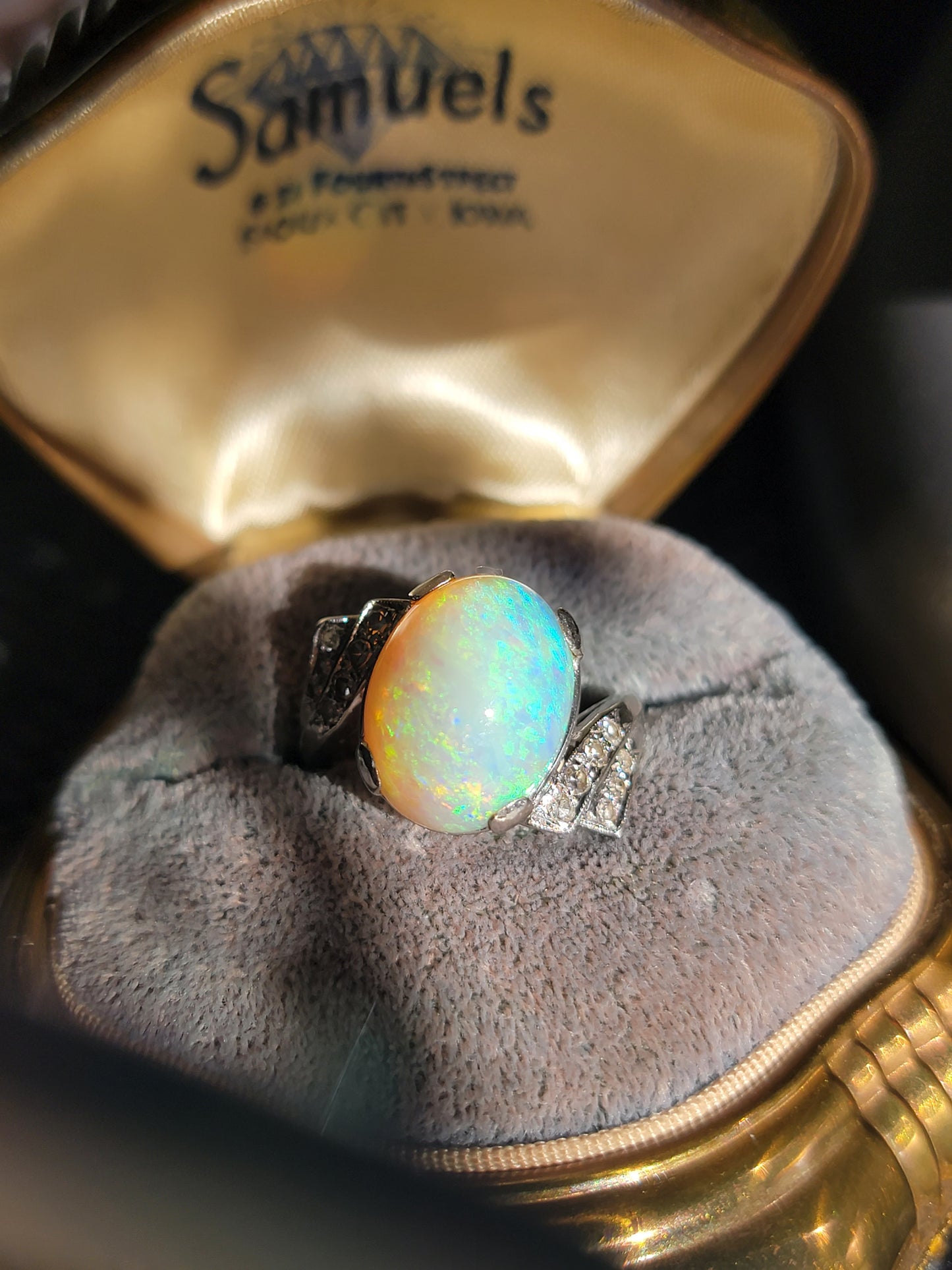 Words really cannot begin to describe this kaleidoscopic Opal. A whopper of an oval cab, set in a 14kt bypass setting with diamonds. Likely custom made in the 1940's. The setting reminds me of a pilot's wings. I also see angel wings. How about you?