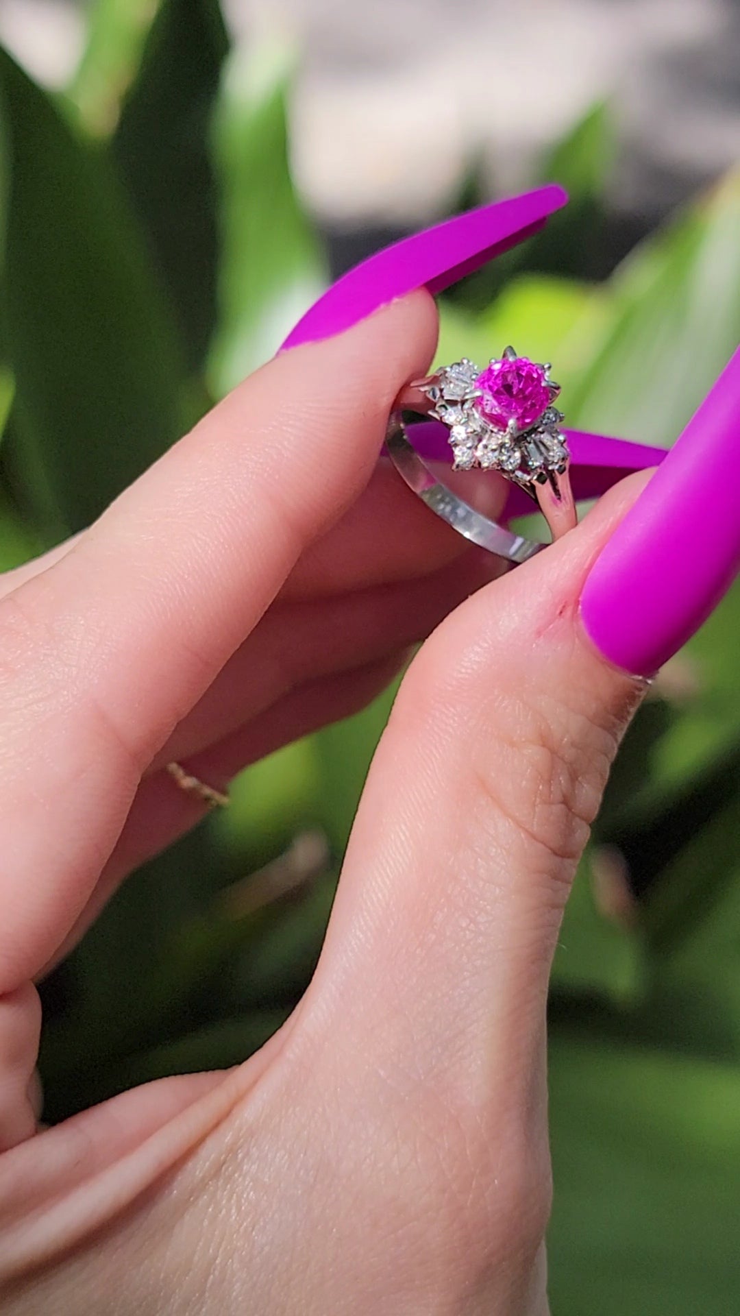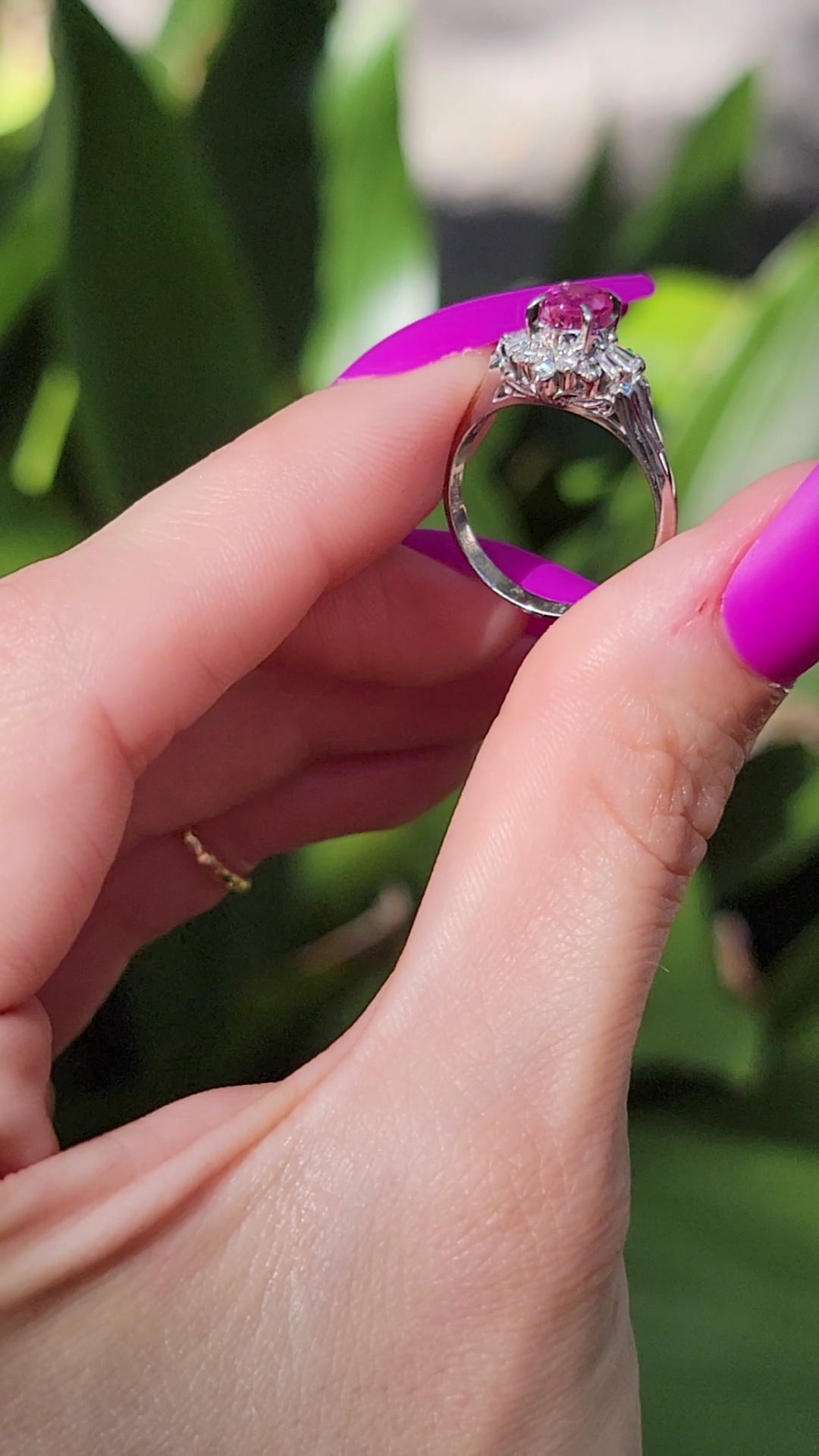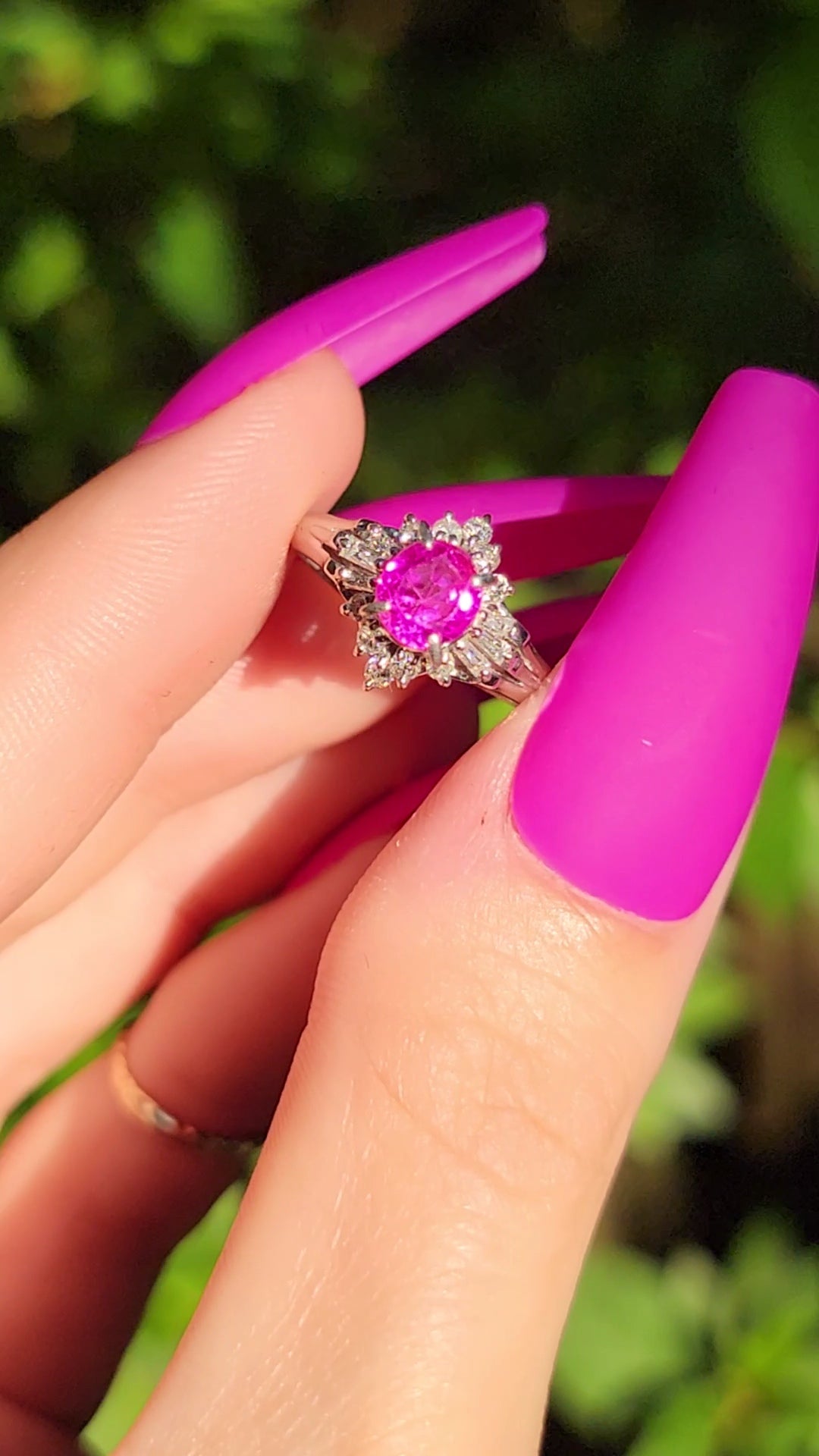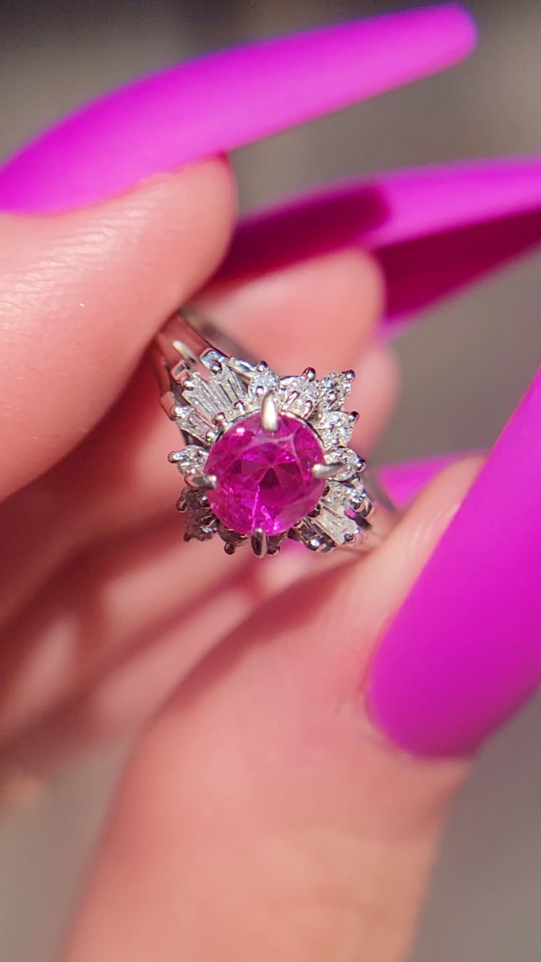 Have you ever seen such a fiery pink Ruby? This ballerina is an absolute knockout and will likely take the principal position in your daily sparkle. She's forged in gorgeous platinum and weighs in at approximately 4.6 grams. She features an undeniably bright Ruby center stone that is approximately 1.3ct. The sparkly tutu shines with approximately .27ct of diamonds. Will you take the lead on this one? She's waiting for you.